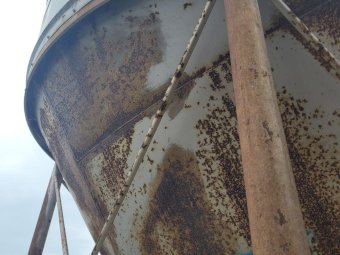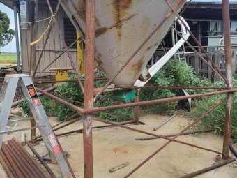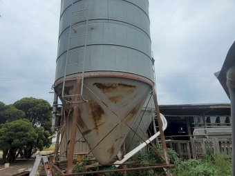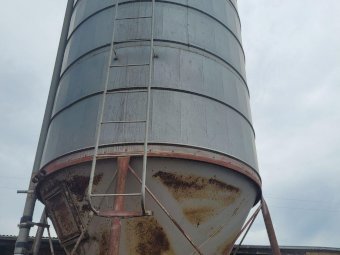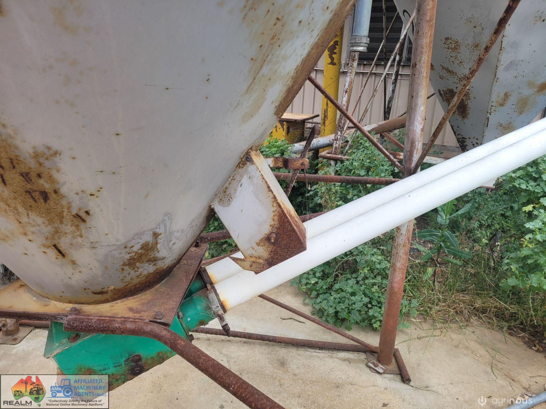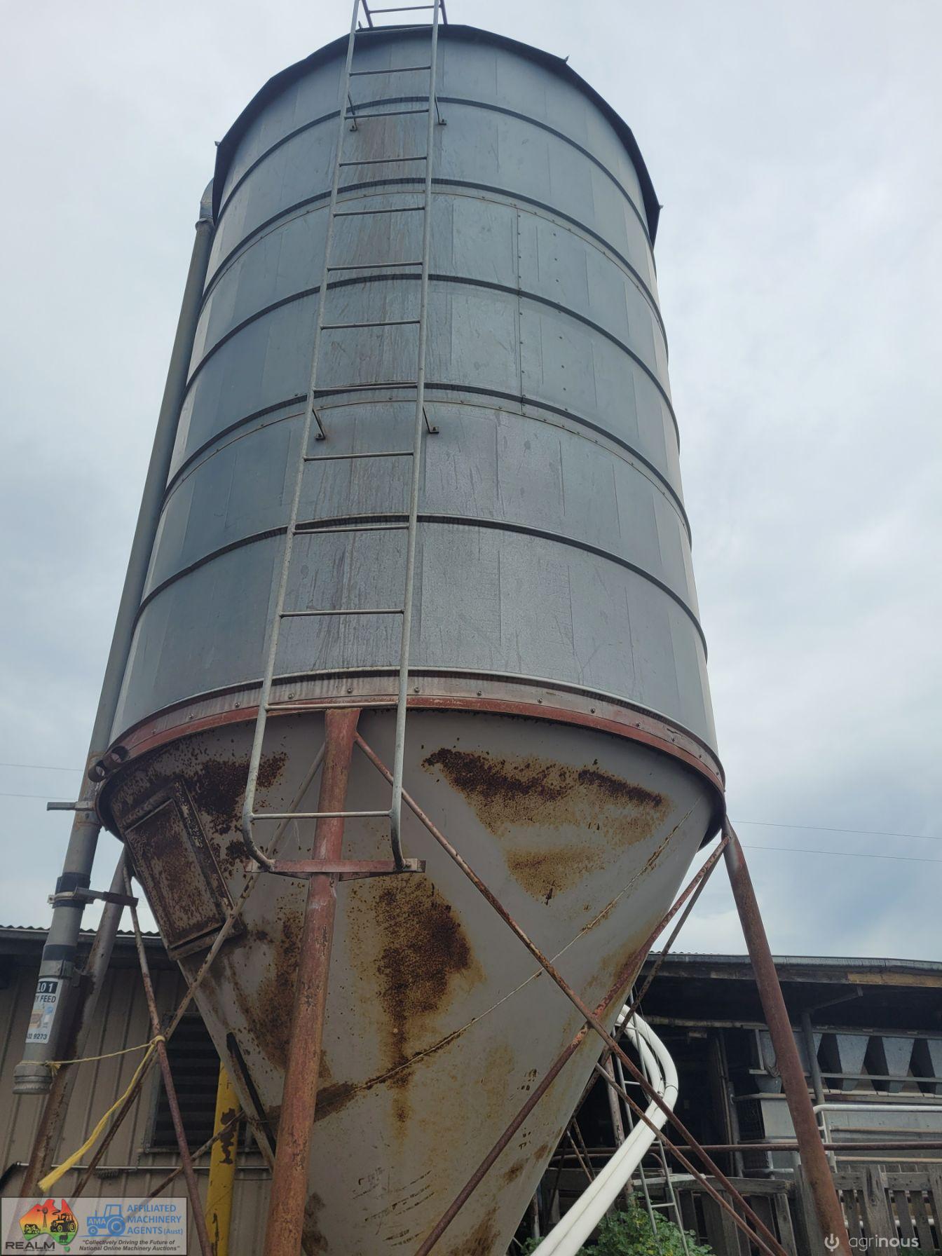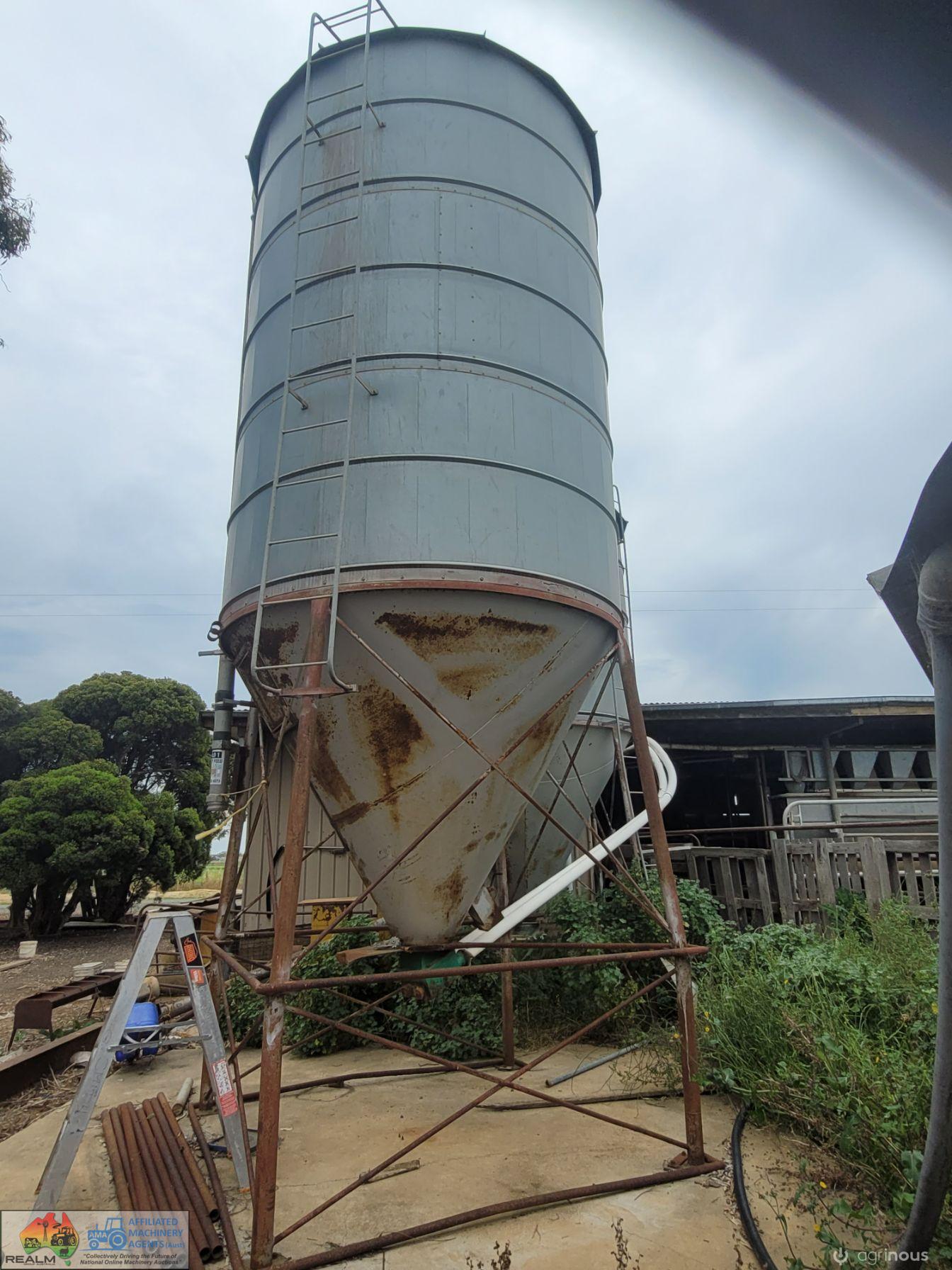 12 Ton Nelson Silo (No.1) ~ On extended base/legs ~ Blower tube ~ Pellet cone ~ No known cone damage, only surface rust. (NB: Green Flexi-auger base is not included, will be sold with dairy feed system)