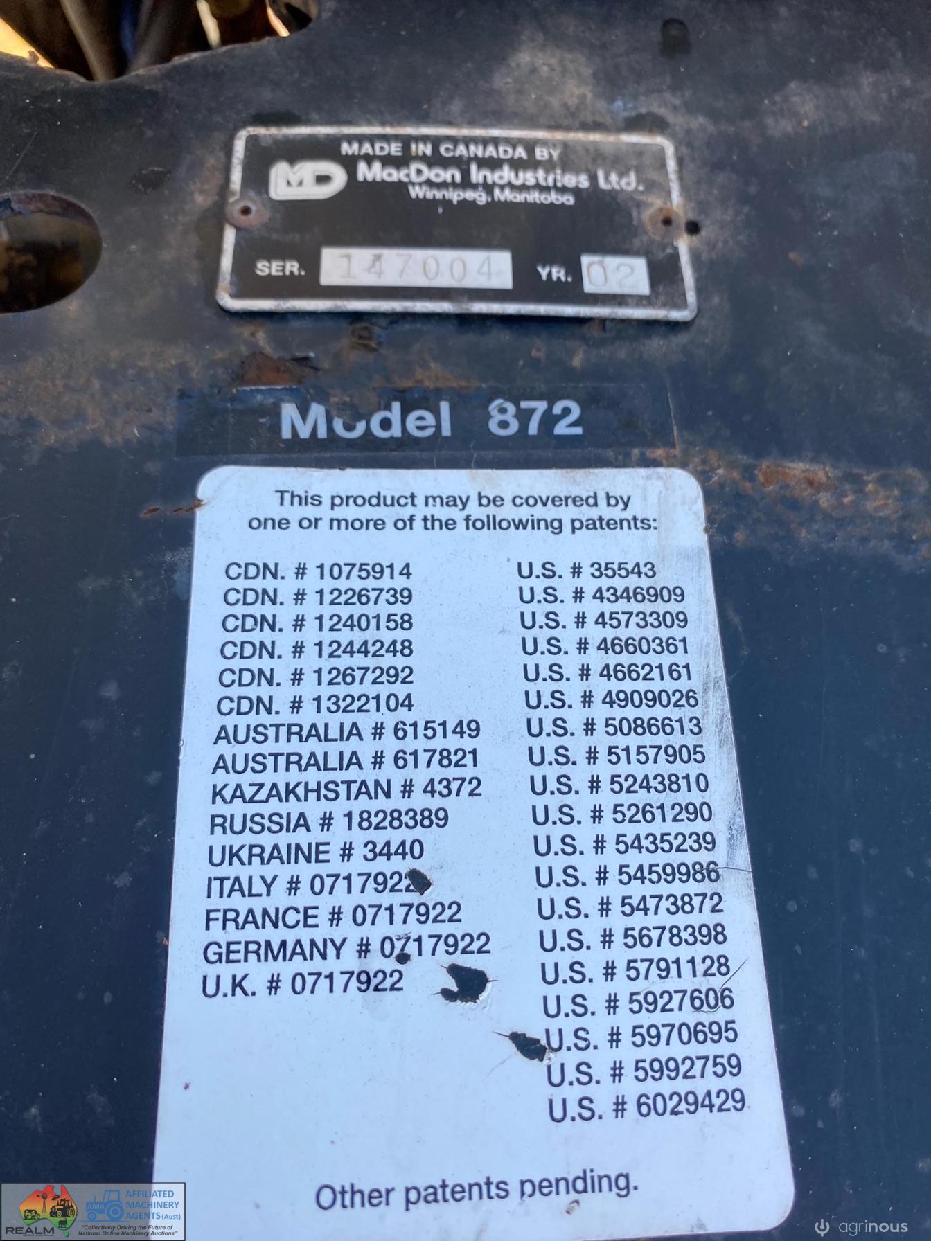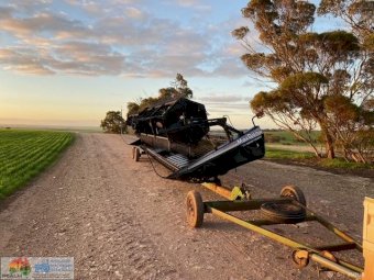 Macdon Header Front on Comb Trailer ~ 30ft 972 macdon , double drive knife, movable decks for windrowing , done 600ha on extensive pre season at local macdon dealer , comes with a box of spares. Good overall condition