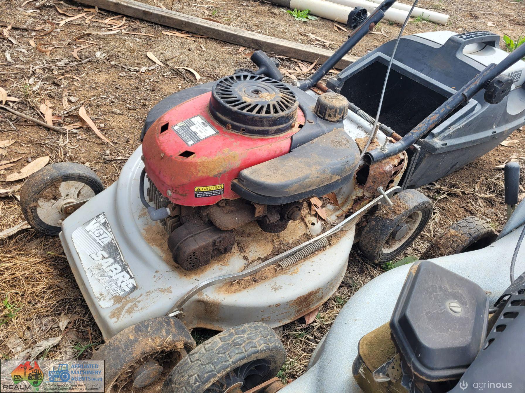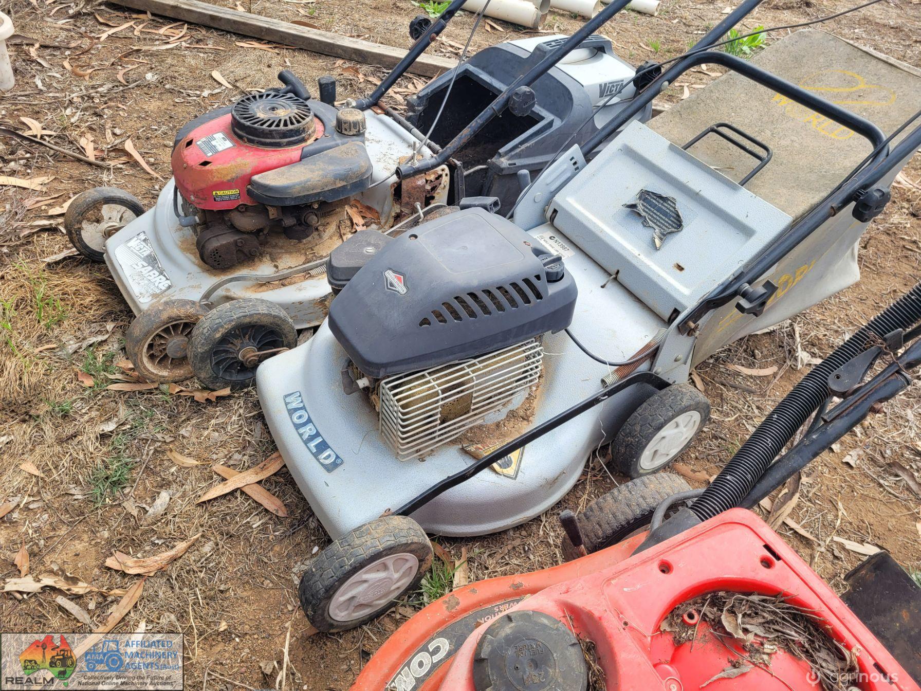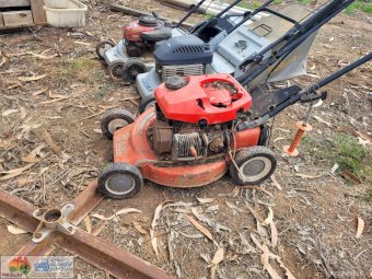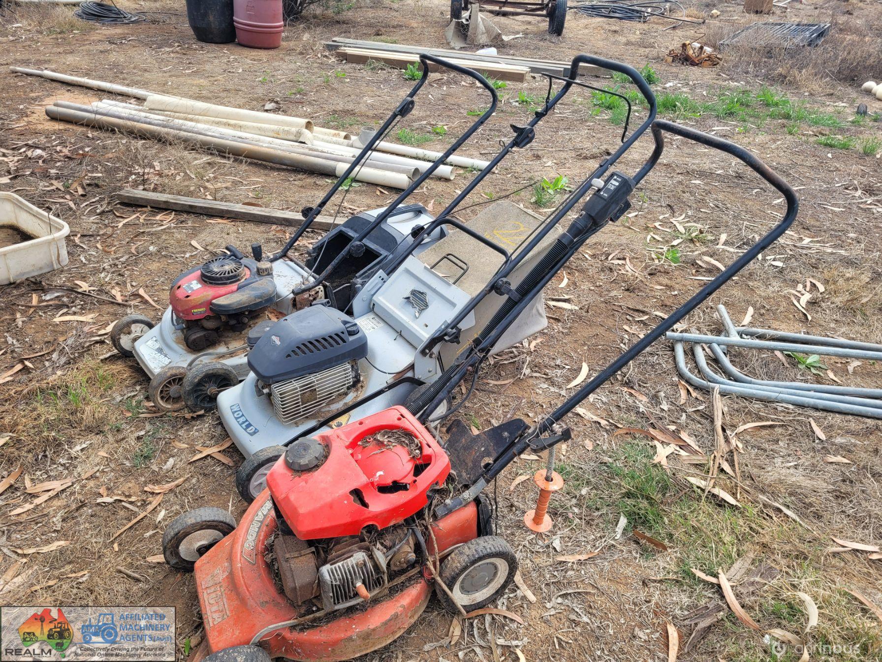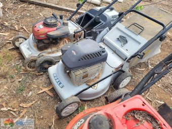 3x Lawn Mowers ~ 2x Petrol ~ 1x Battery Pak (Works, but needs new battery)
