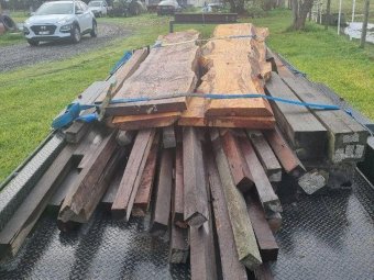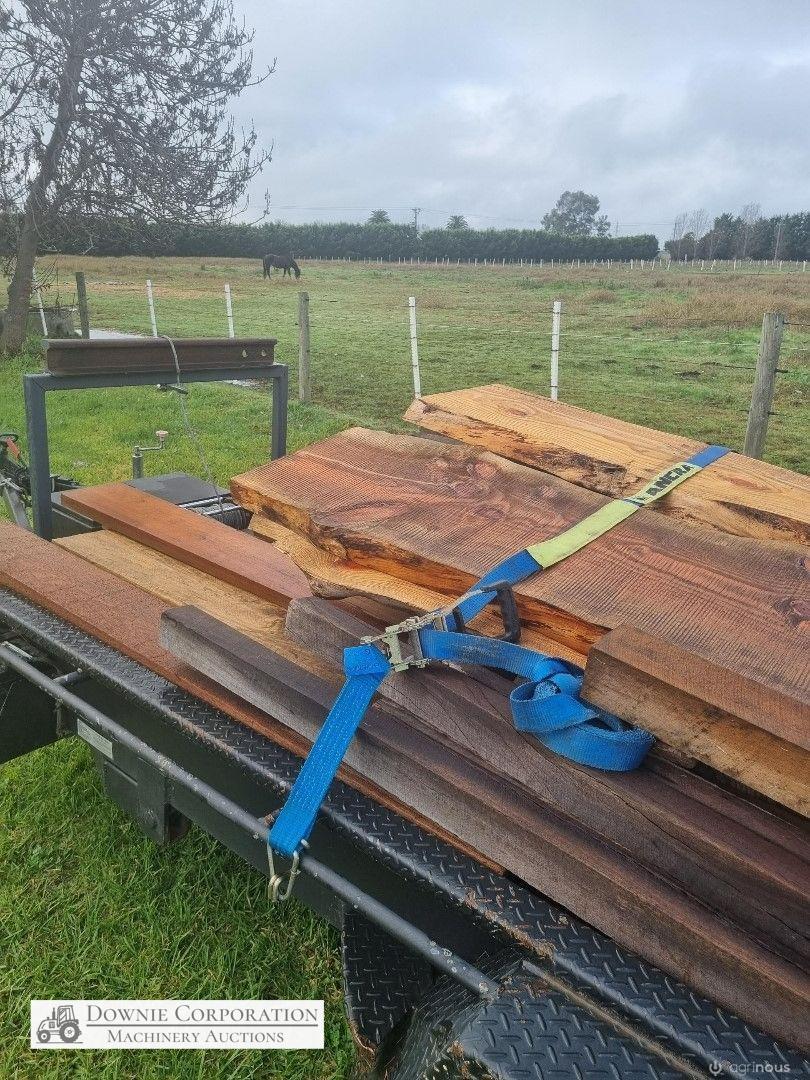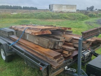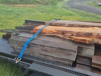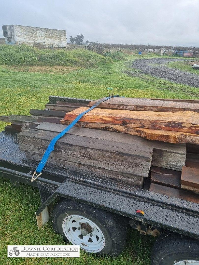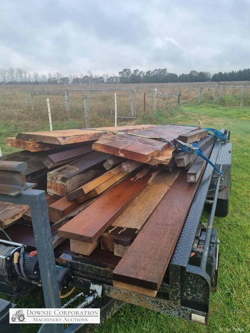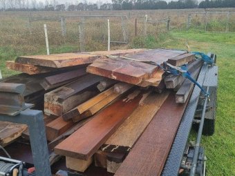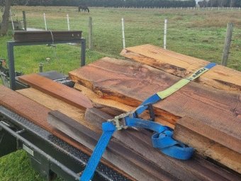 4 x Oregon Slabs of furniture timber, ideal for table or bench seats (other timber in photos is not included, just 4 slabs on top of trailer)