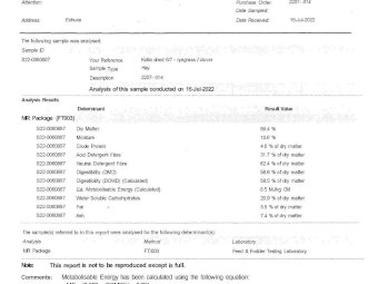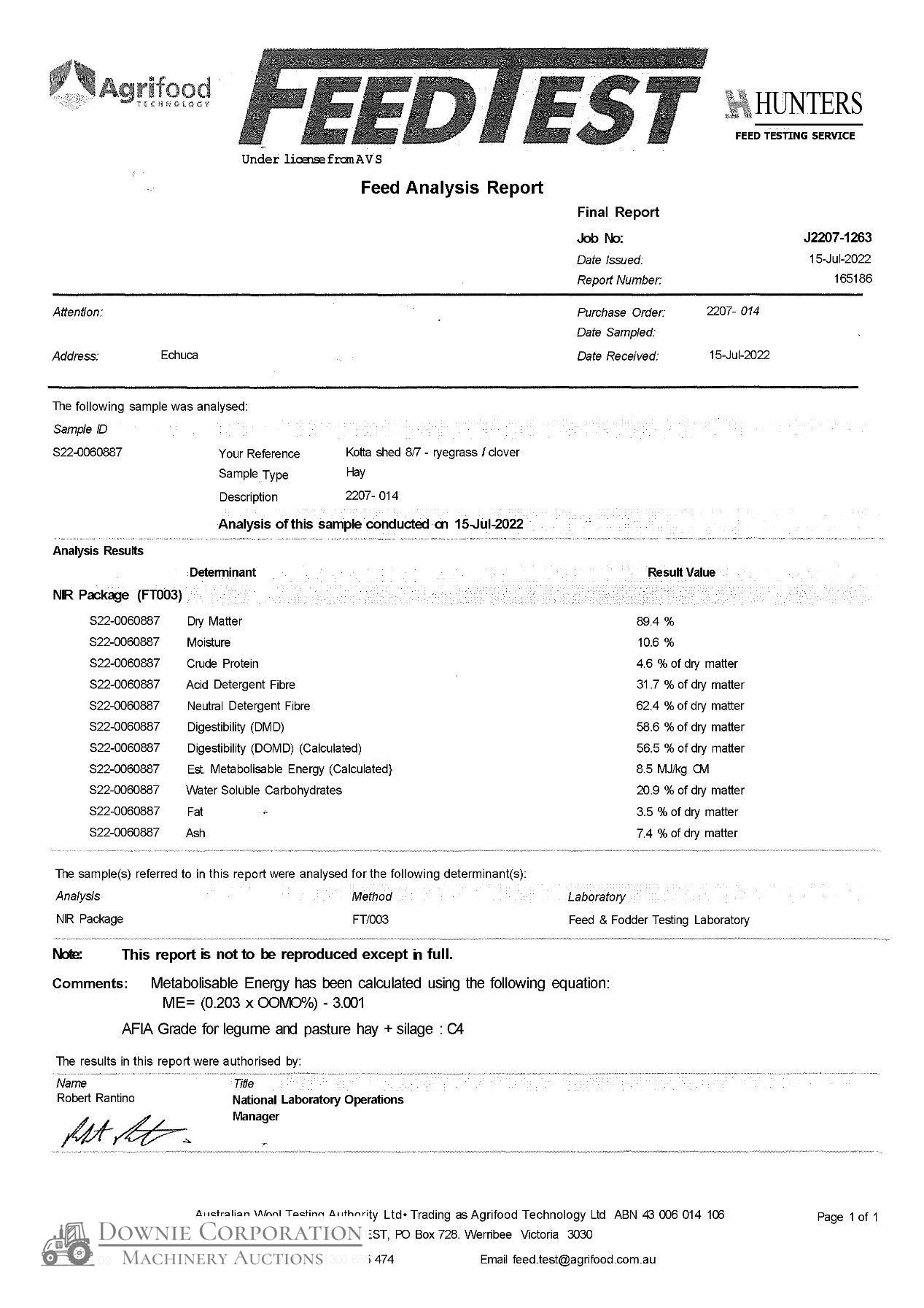 64 (8x4x3) Squares of Quality Ryegrass & Clover Pasture Hay; Professionally conditioned & baled; Ave weight per bale 586Kgs; Always shedded, no weather damage; Feed Test attached - (NB: 40 bales = drop deck load) Amount purchased can vary by request. - Bidding is per bale price