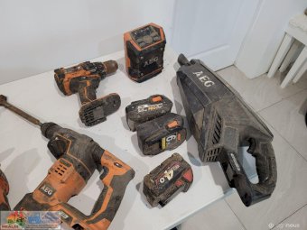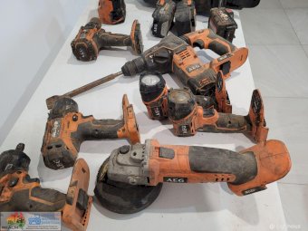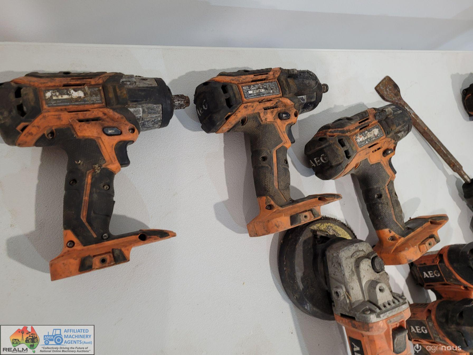 AEG 18v Cordless Tools ~ Angle grinder ~ 3x impact 1/2" socket drivers ~ Cordless drill ~ Jack hammer ~ 2x Torches ~ Speaker ~ Vacuum ~ 3x Batteries.