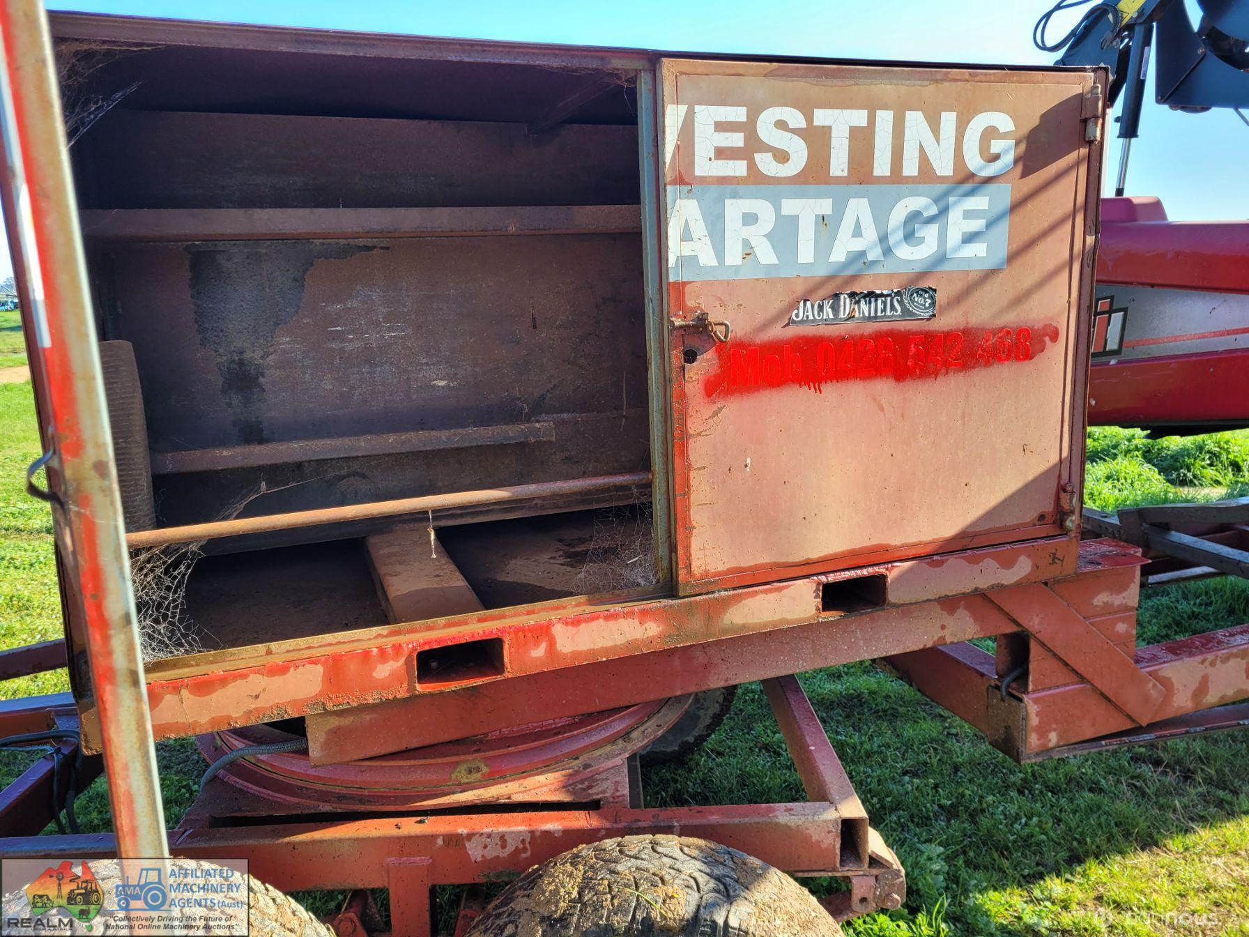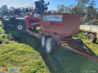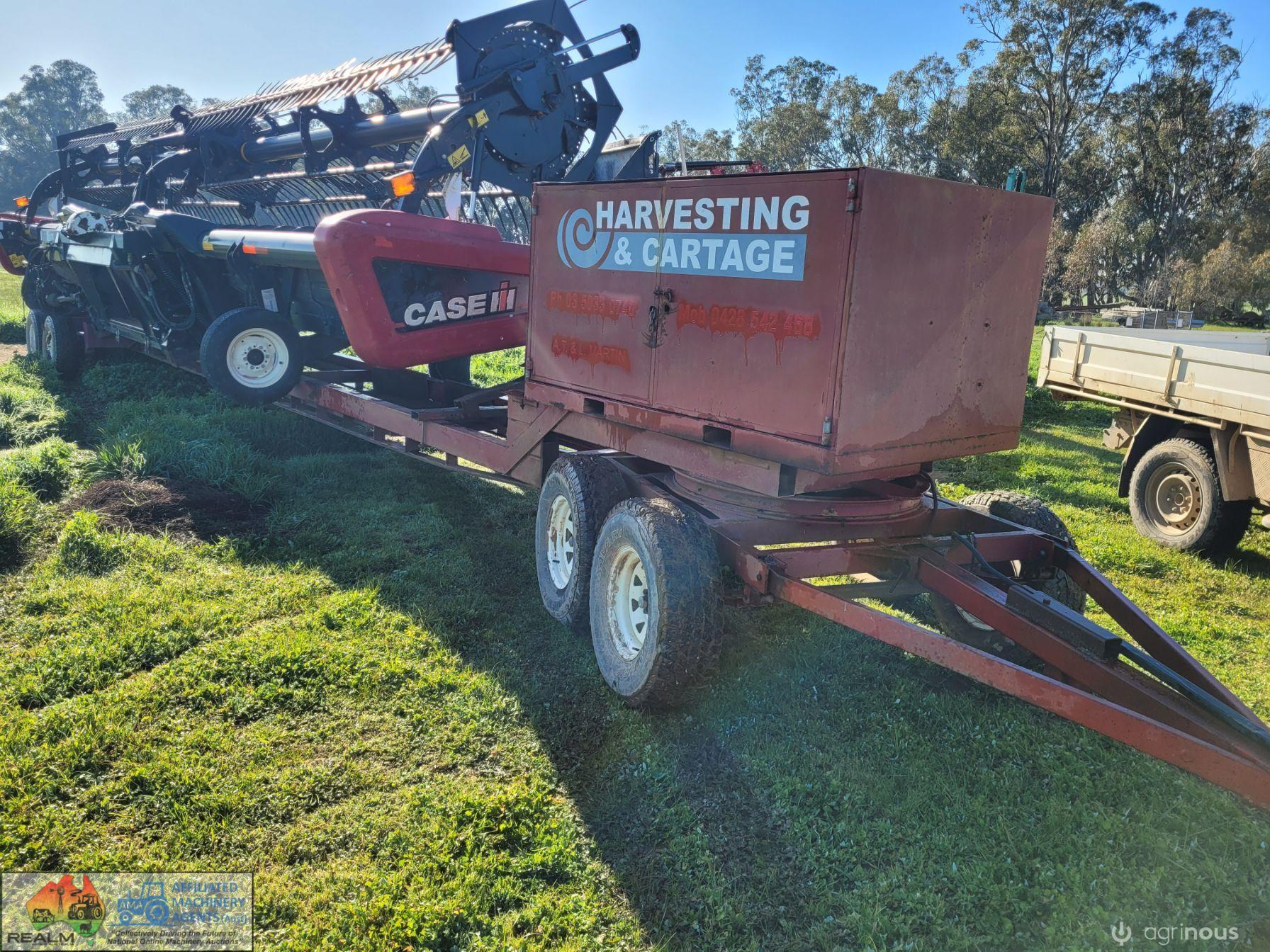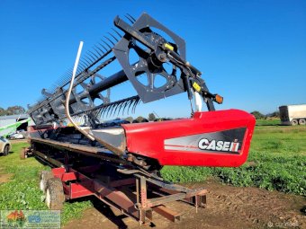 Case 2162-35 Flexi Draper Front ~ 35ft ~ Manufactured by MacDon ~ Good rubber belts ~ Cross feed auger ~ Exc. quality, hardly used ~ Minimal to no wear on skids ~ Solid well engineered comb trailer ~ Originally made for 39ft front, has been cut back (extra length included) ~ Ball race turntable ~ 15" Toyota wheels & tyres ~ Double sided lock-up tool box, for oils, parts & sundry tools. ~ This would suit a NEW BUYER's requirements.