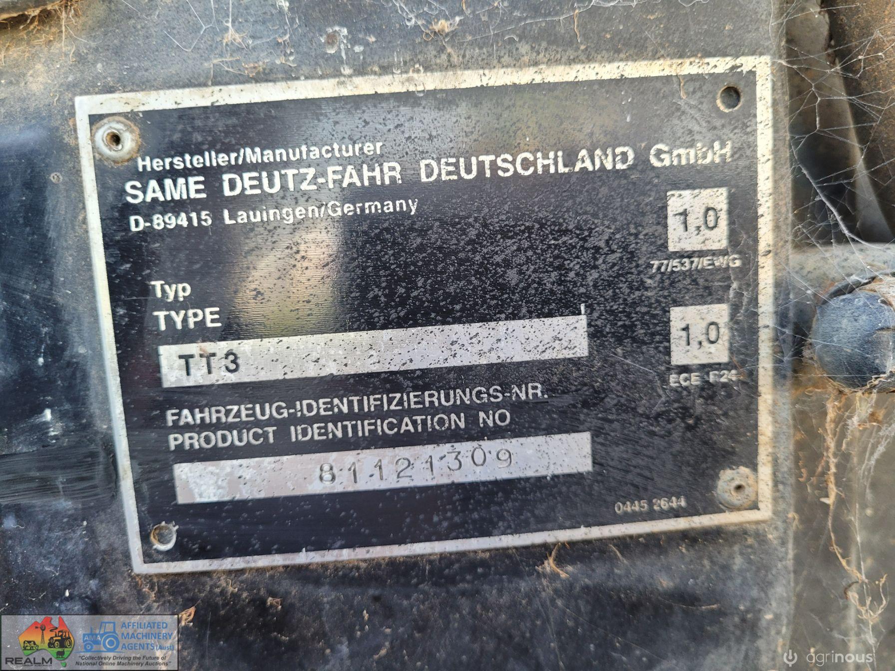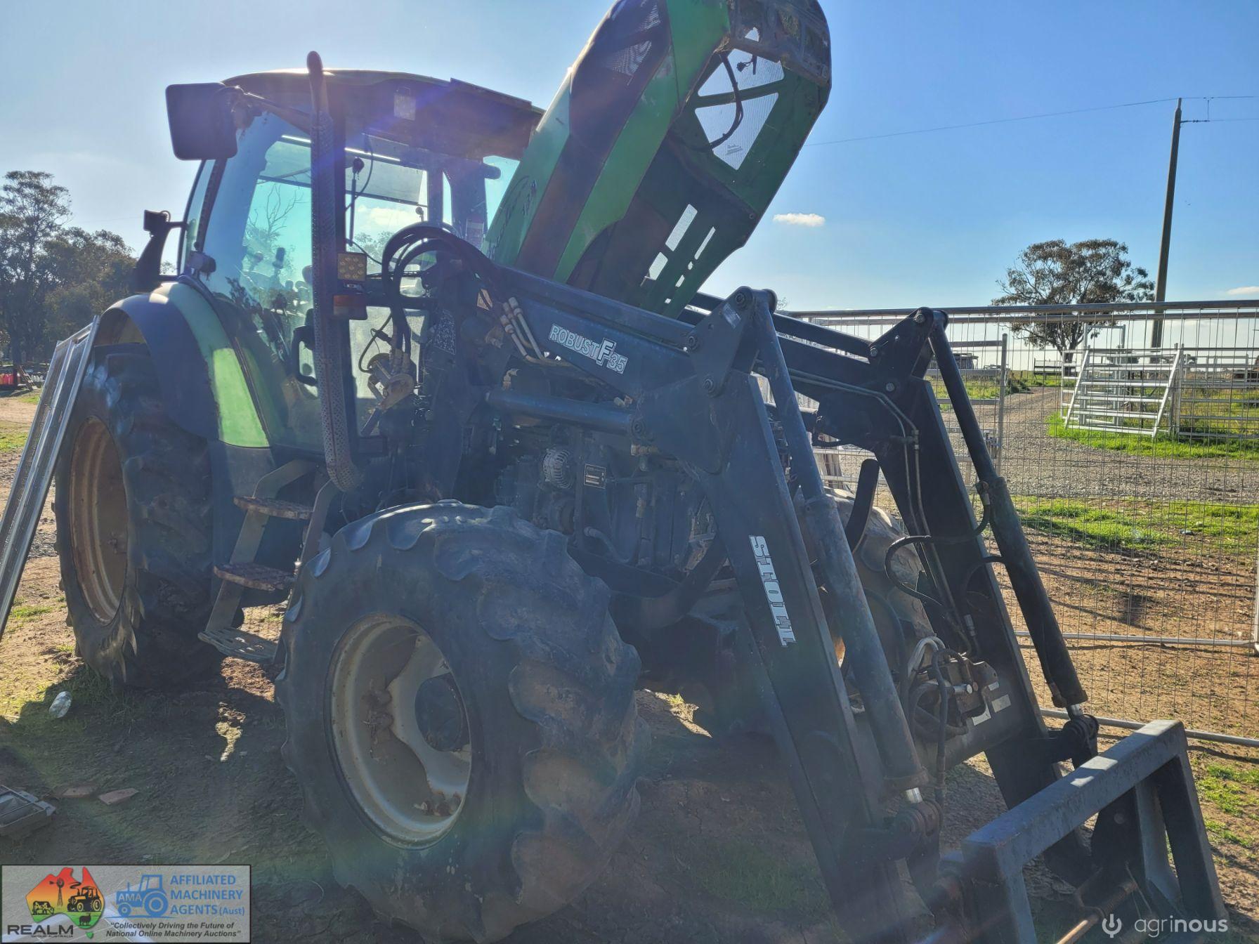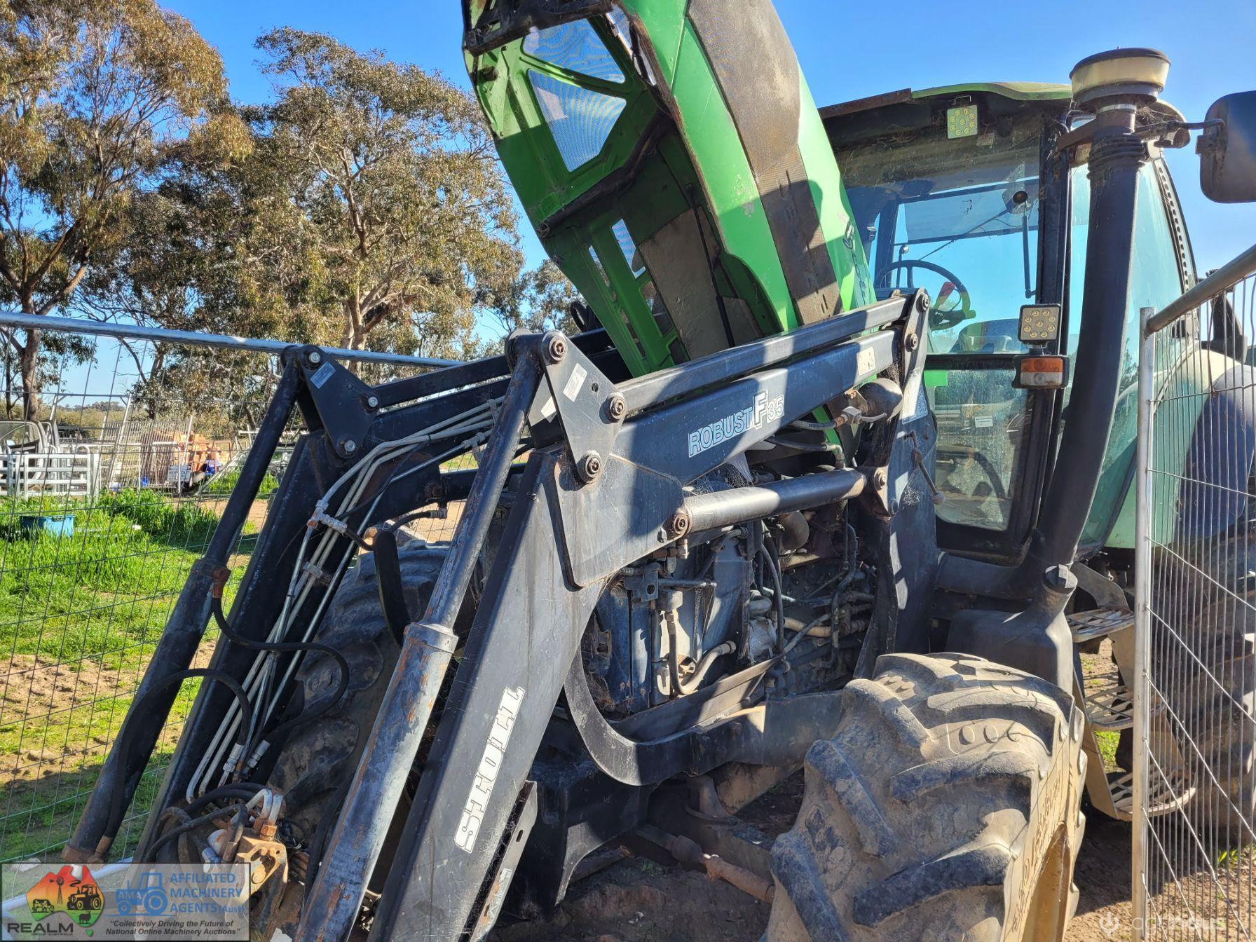 Deutz Agrotron 128Hp Tractor with Robust F35 level lift FEL ~ 6cyl Turbo diesel ~ 9,400 Hrs ~ Shuttle shift ~ Hay forks & 6ft bucket ~ Dual remotes, 3pl, 2sp PTO ~ Tyres R=75%, F=15% ~ Engine starts & runs well ~ New starter mtr & alternator fitted & now computer is showing Error #N91 (Faulty Creeper Mode), needs attention from qualified Deutz Dealer (possibly a faulty sensor) ~ NB: Tractor won't drive, but was working fine before fault ~ Suit repair or wrecking.