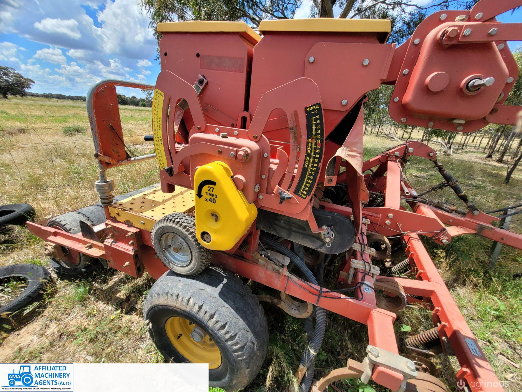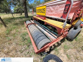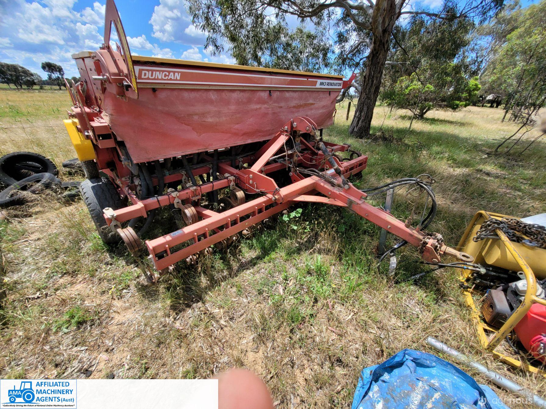 Duncan 23 run Mk3 seeder/renovator. Seed and frt boxes Plus separate small seed box and one set of new coulters supplied (not fitted)original tyres. Solid rubber tyred roller. Paddock ready.