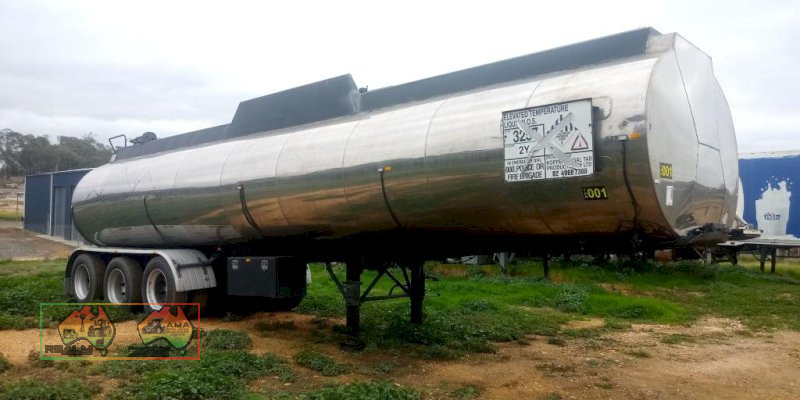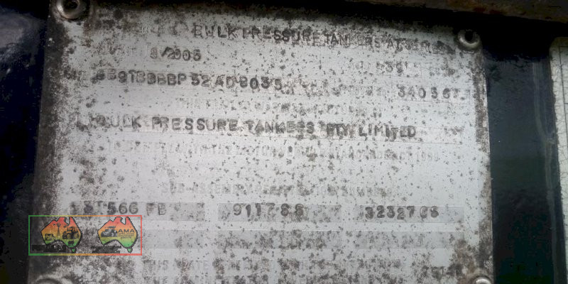 Bulk pressure tanker, series AT. Emulsion tank, triaxle, air bag, alloys. Liquid load 32000, tank capacity 34000 Date tested June 2015. To be redone 2017. Unused for several year. CP 08/05 Vin:6B9BBBBP52AD8035 atm 39000KG Alloy tank with stainless steel lagging. Clean and straight tidy trailer
