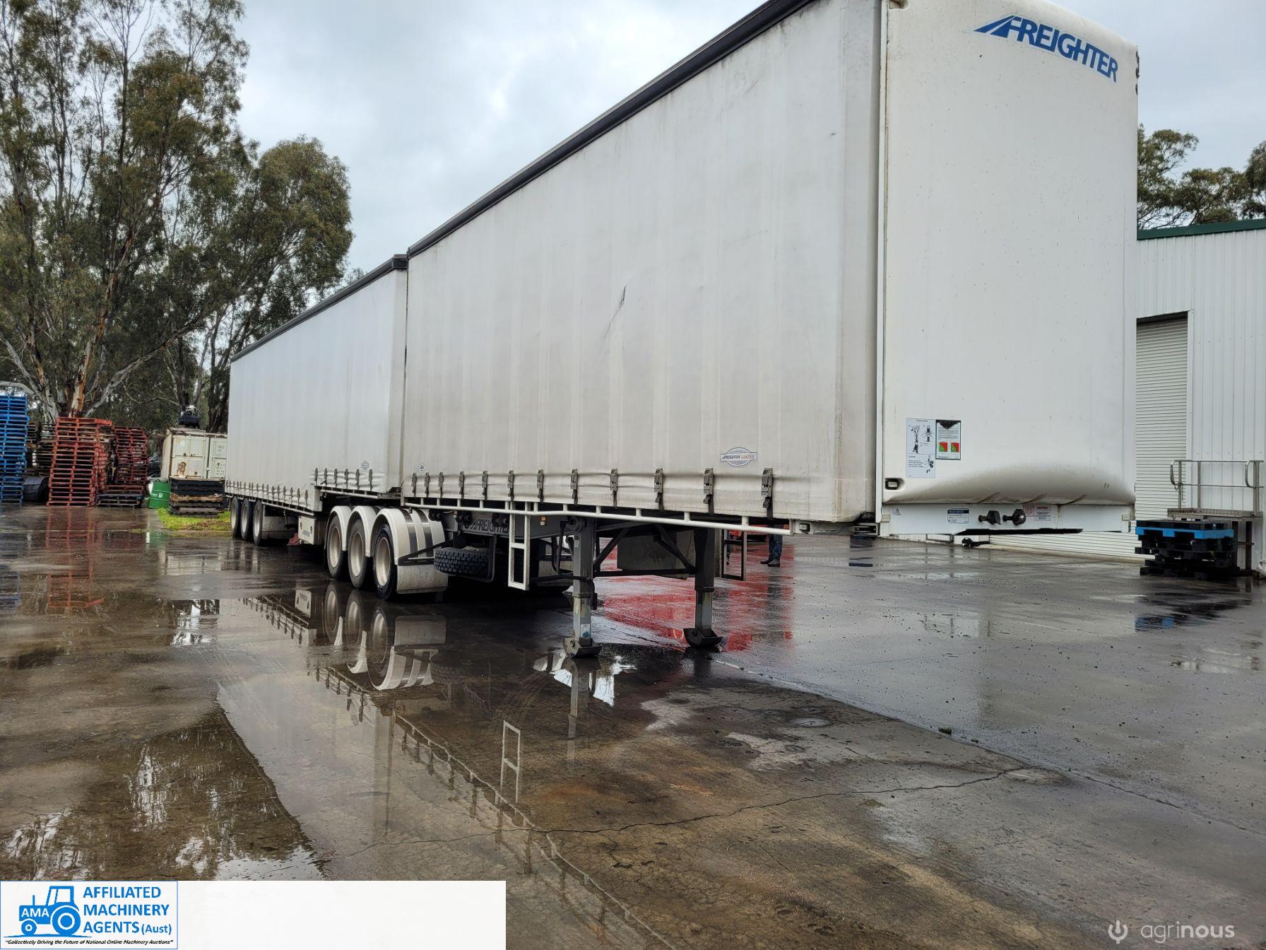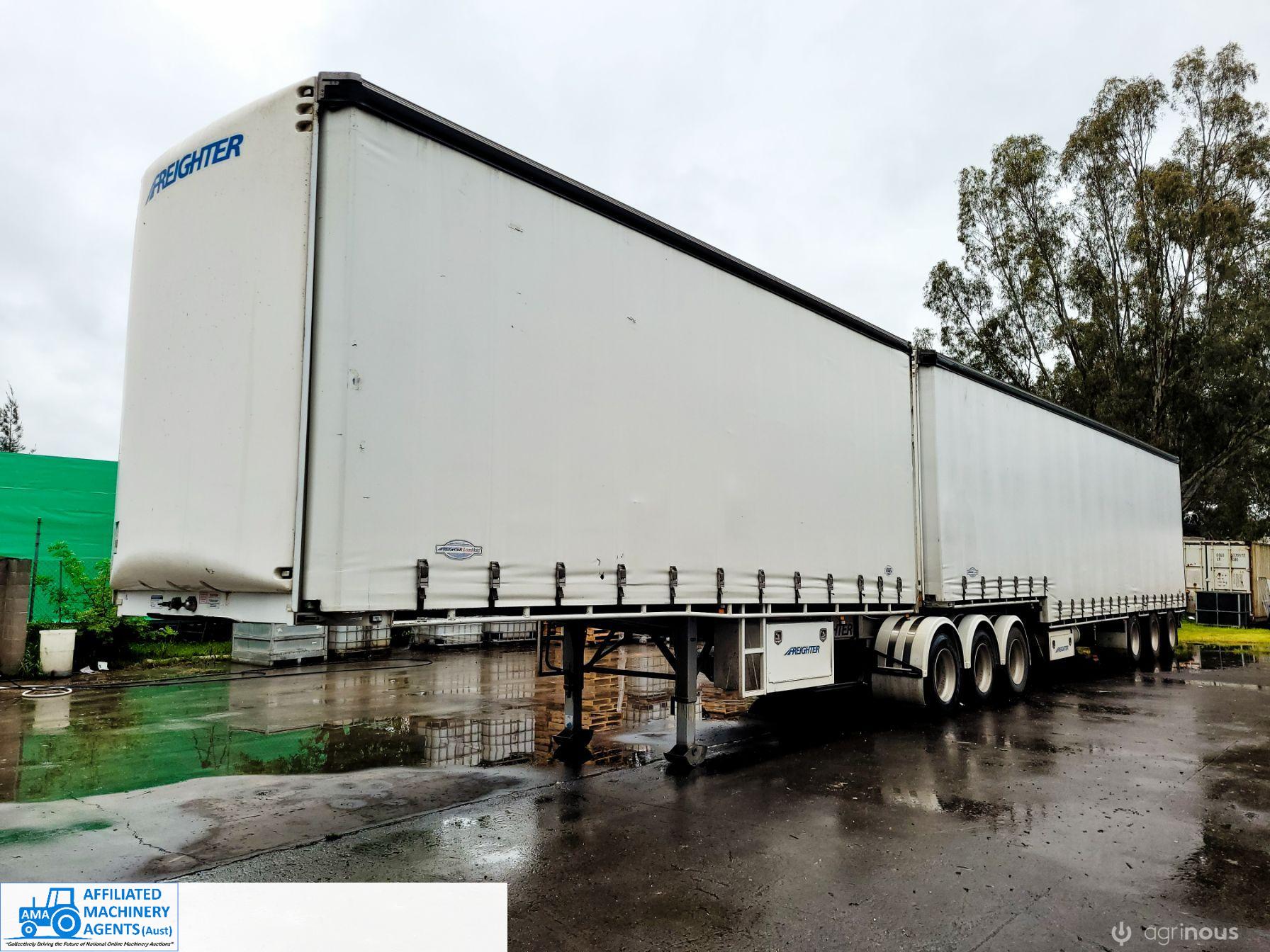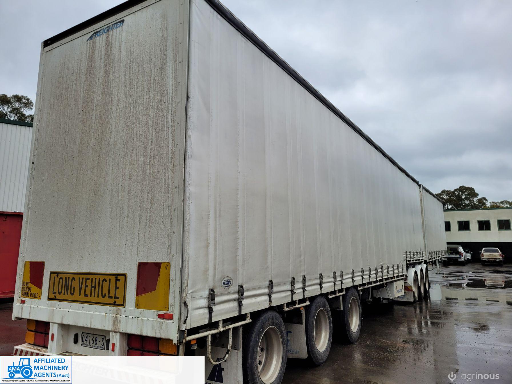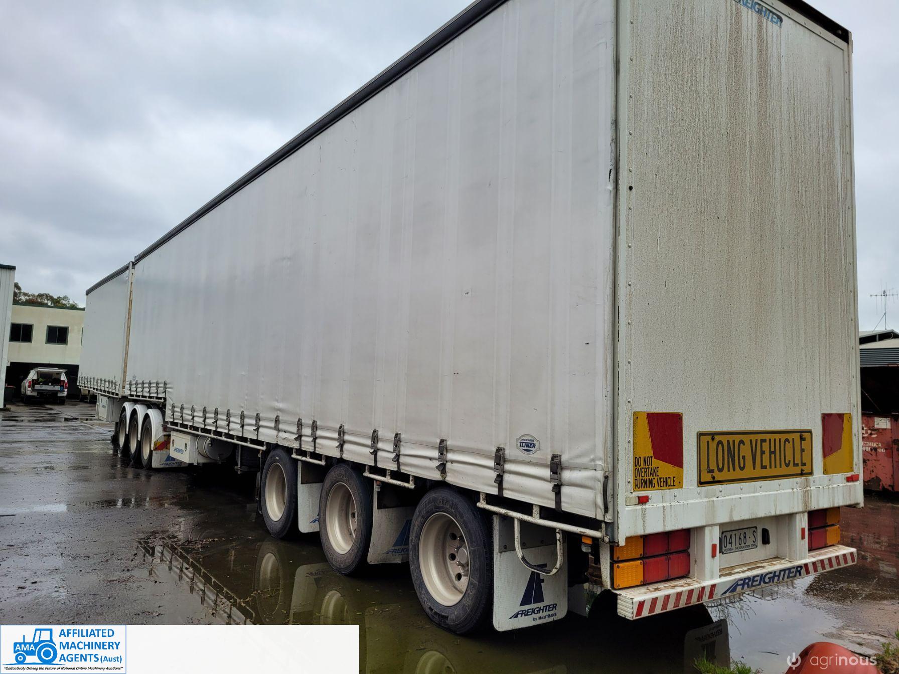 Freighter Maxi-Trans B-Double Tautliner A&B Trailers 5/13 built, one owner. 16 ply R168 radials on alloy rims. A trailer 7.5m (12 pallet) - B trailer 13.7m (22 pallet) - Overall length 21.55m. Good quality side curtains & floor. 2 spare wheels, tool boxes, good tyres. Current Vic rego (A = 4/11/22 & B = 28/12/22). Currently in use, should pass Roadworthy Inspection (Sold without RWC) - These 2 combination trailers would Suit New Buyer.