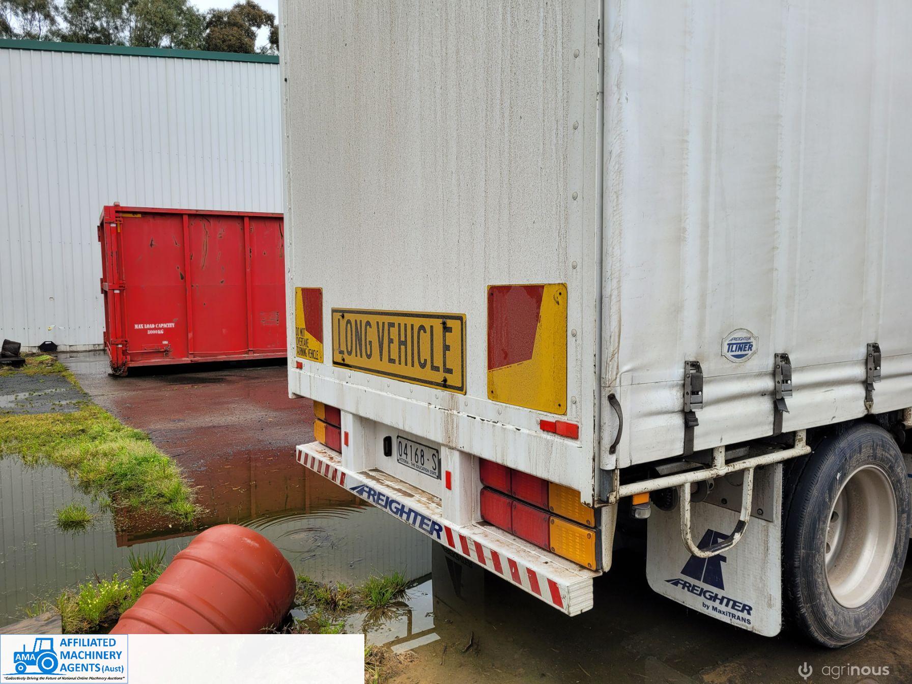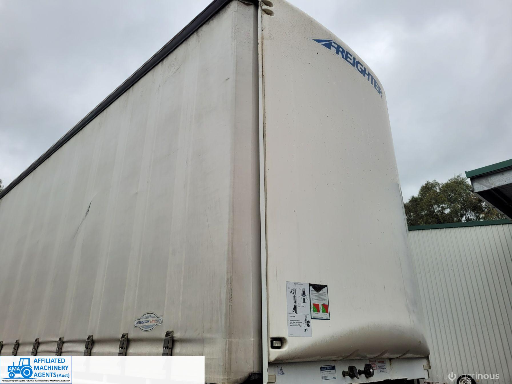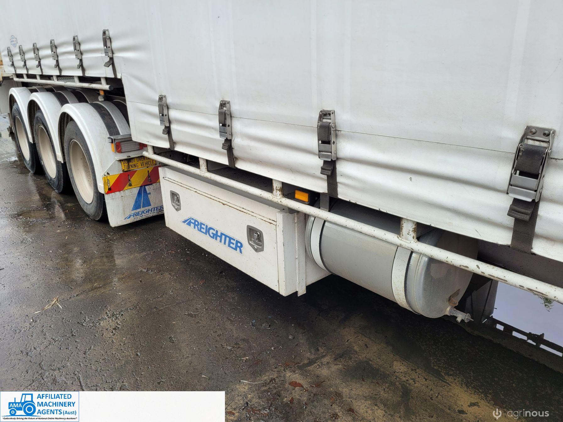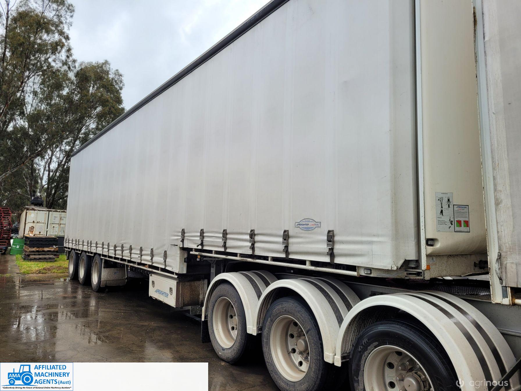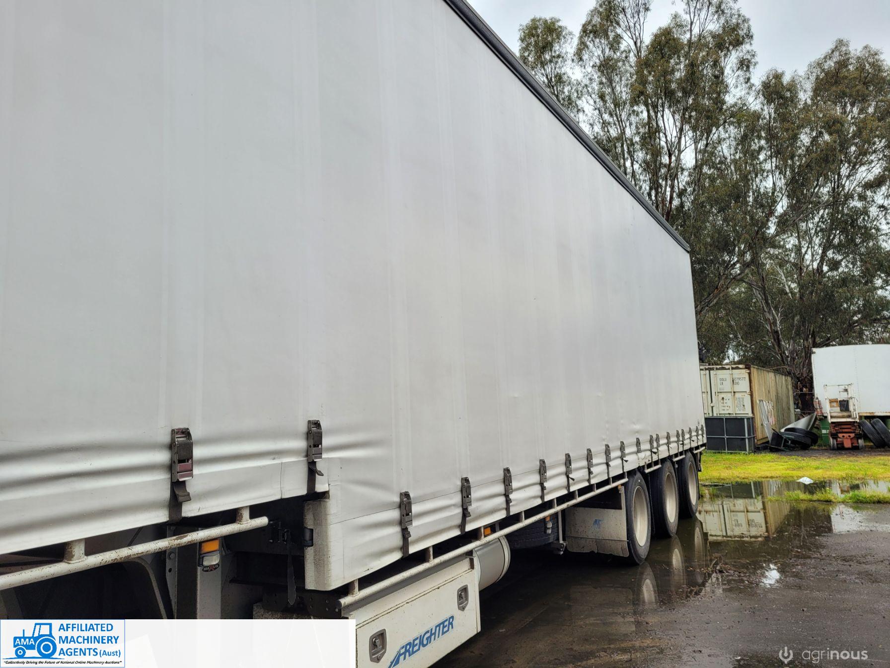 Freighter Maxi-Trans B-Double Tautliner A&B Trailers 5/13 built, one owner. 16 ply R168 radials on alloy rims. A trailer 7.5m (12 pallet) - B trailer 13.7m (22 pallet) - Overall length 21.55m. Good quality side curtains & floor. 2 spare wheels, tool boxes, good tyres. Current Vic rego (A = 4/11/22 & B = 28/12/22). Currently in use, should pass Roadworthy Inspection (Sold without RWC) - These 2 combination trailers would Suit New Buyer.