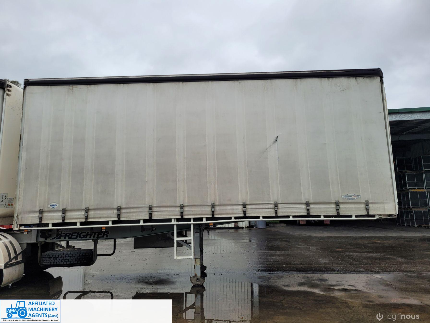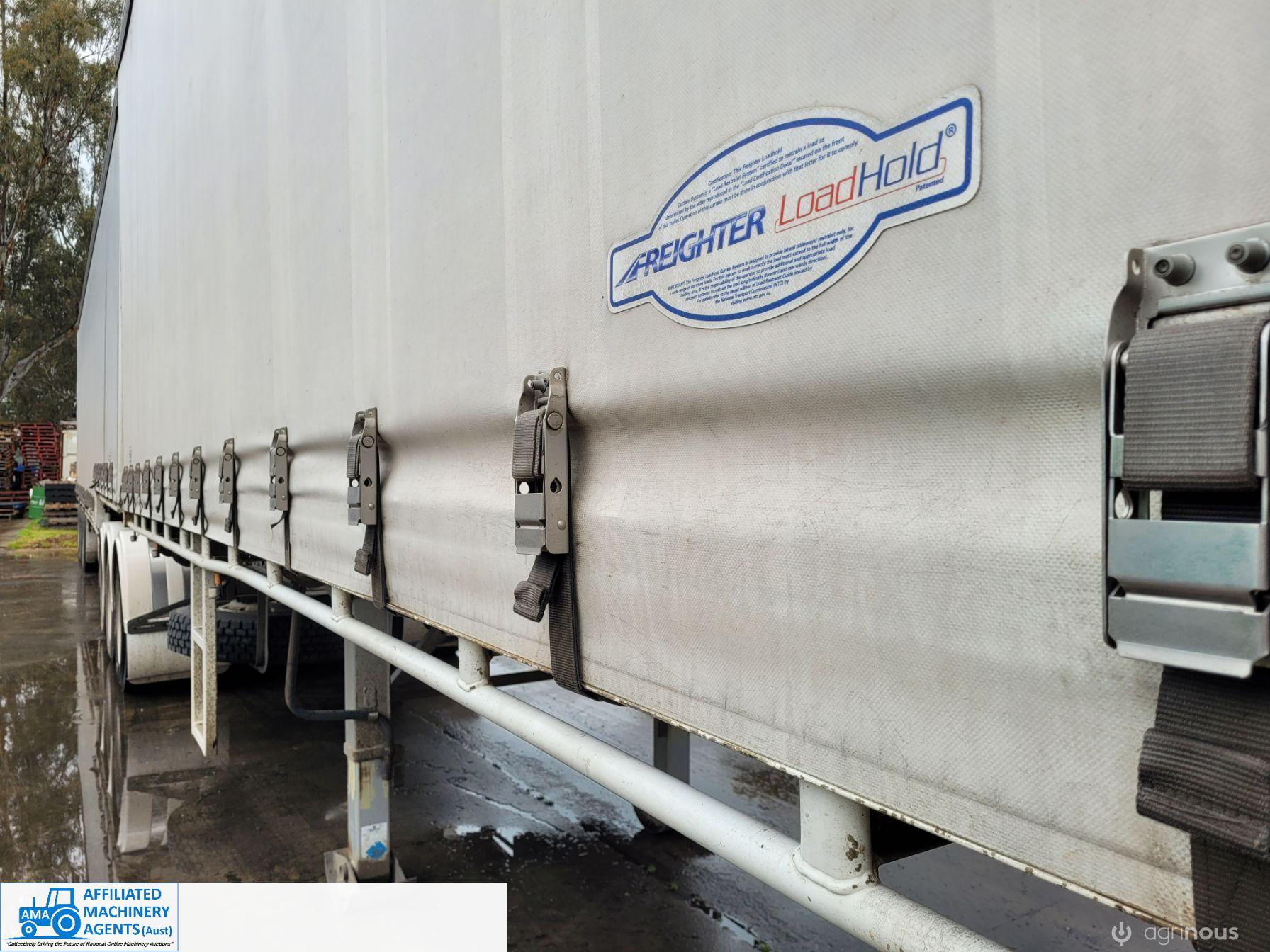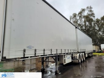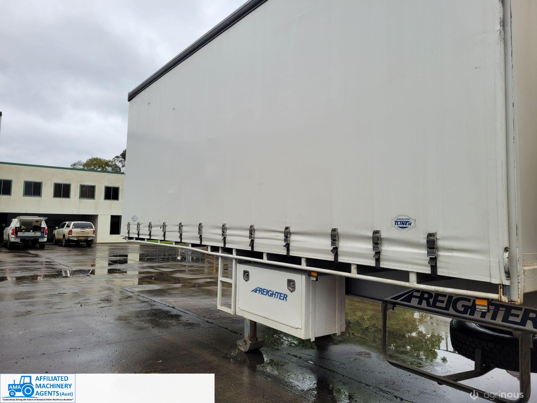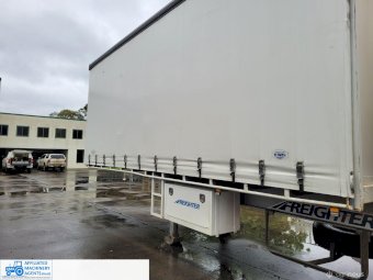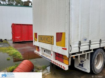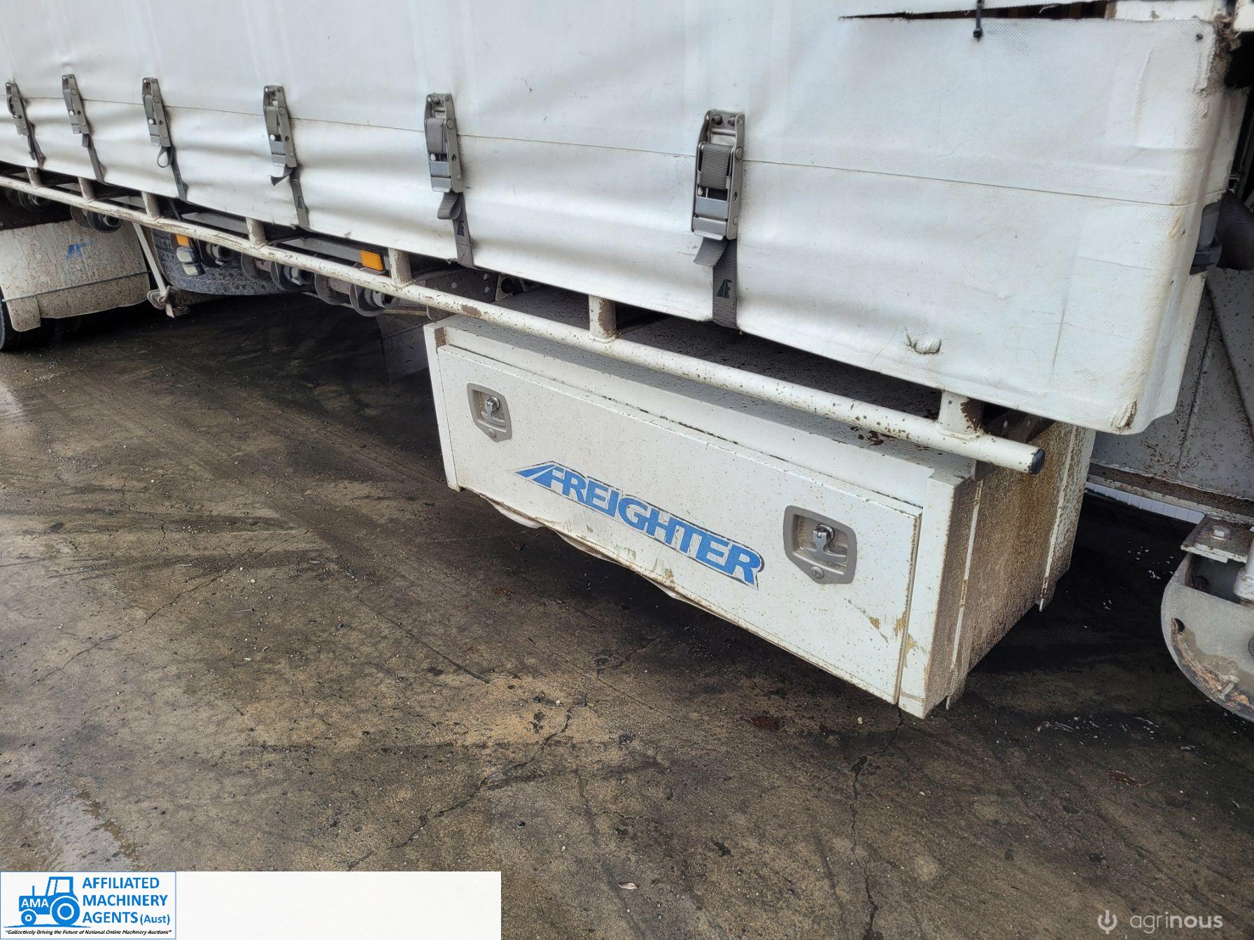 Freighter Maxi-Trans B-Double Tautliner A&B Trailers 5/13 built, one owner. 16 ply R168 radials on alloy rims. A trailer 7.5m (12 pallet) - B trailer 13.7m (22 pallet) - Overall length 21.55m. Good quality side curtains & floor. 2 spare wheels, tool boxes, good tyres. Current Vic rego (A = 4/11/22 & B = 28/12/22). Currently in use, should pass Roadworthy Inspection (Sold without RWC) - These 2 combination trailers would Suit New Buyer.