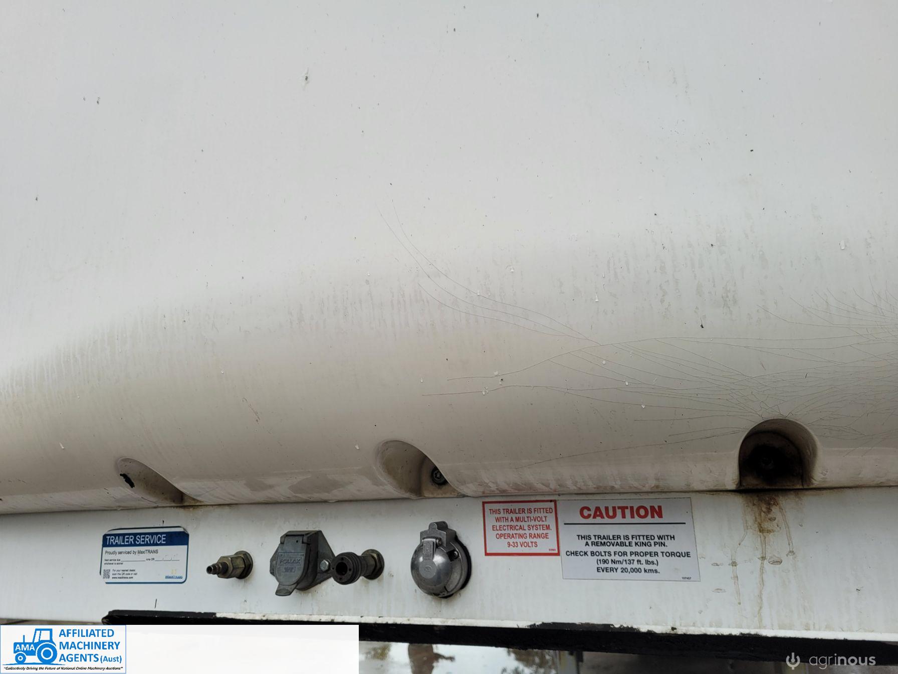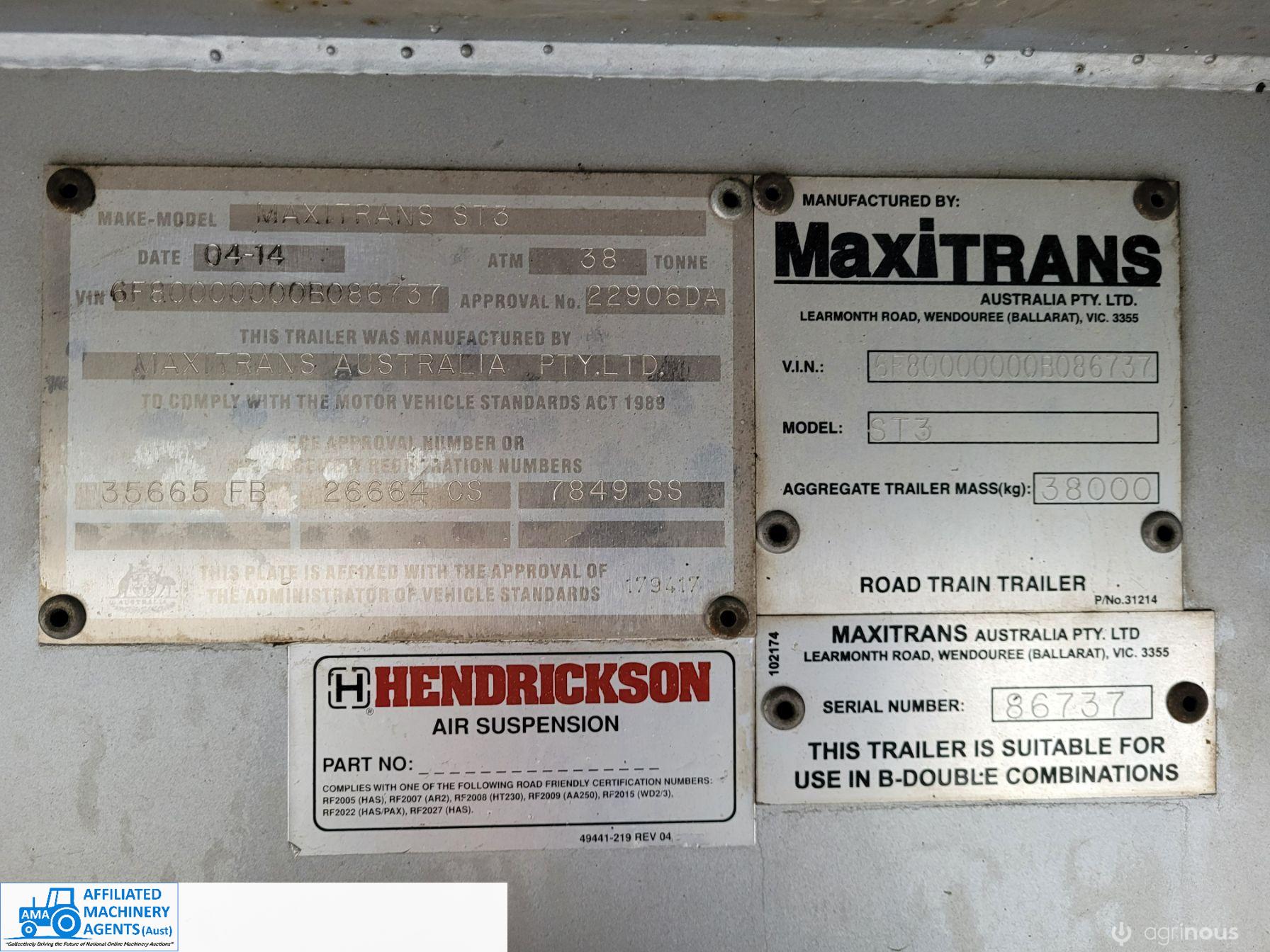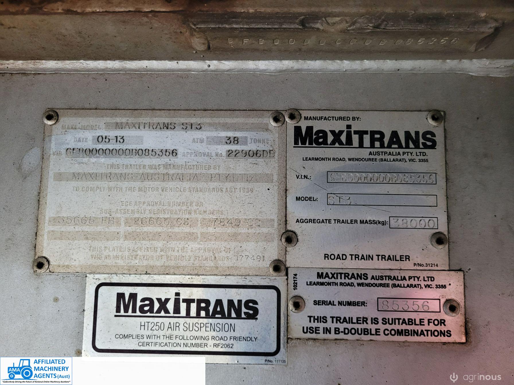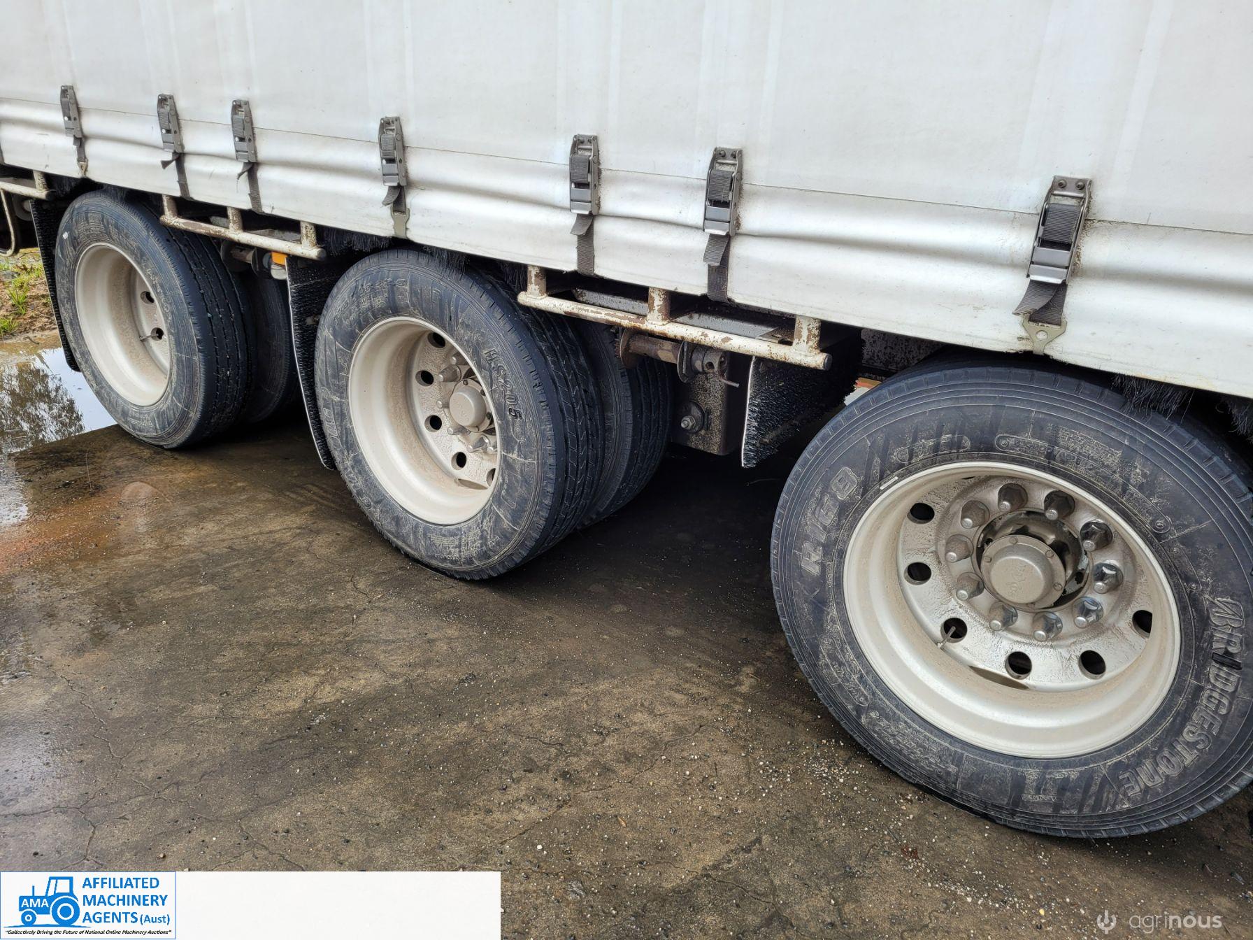Freighter Maxi-Trans B-Double Tautliner A&B Trailers 5/13 built, one owner. 16 ply R168 radials on alloy rims. A trailer 7.5m (12 pallet) - B trailer 13.7m (22 pallet) - Overall length 21.55m. Good quality side curtains & floor. 2 spare wheels, tool boxes, good tyres. Current Vic rego (A = 4/11/22 & B = 28/12/22). Currently in use, should pass Roadworthy Inspection (Sold without RWC) - These 2 combination trailers would Suit New Buyer.