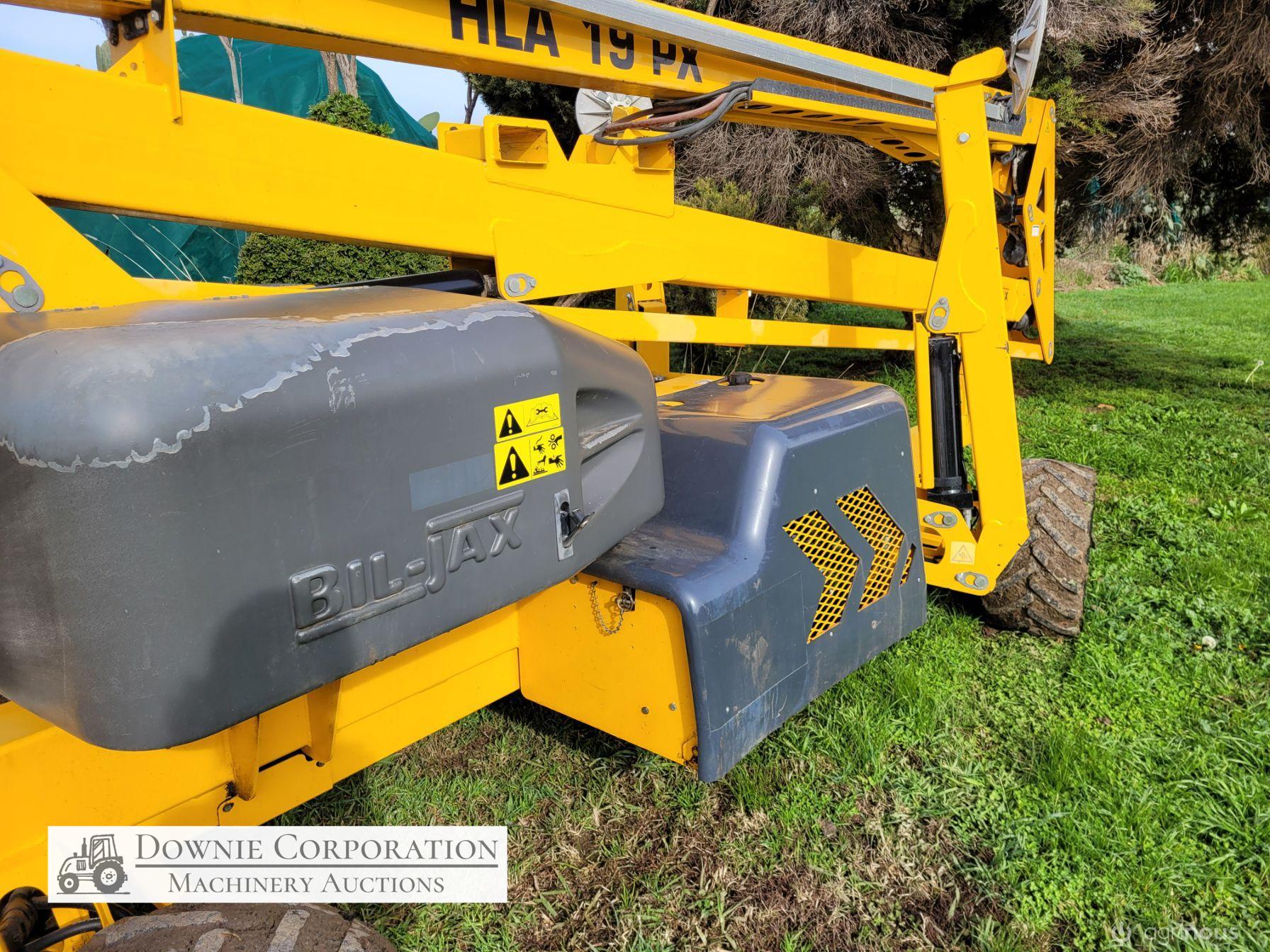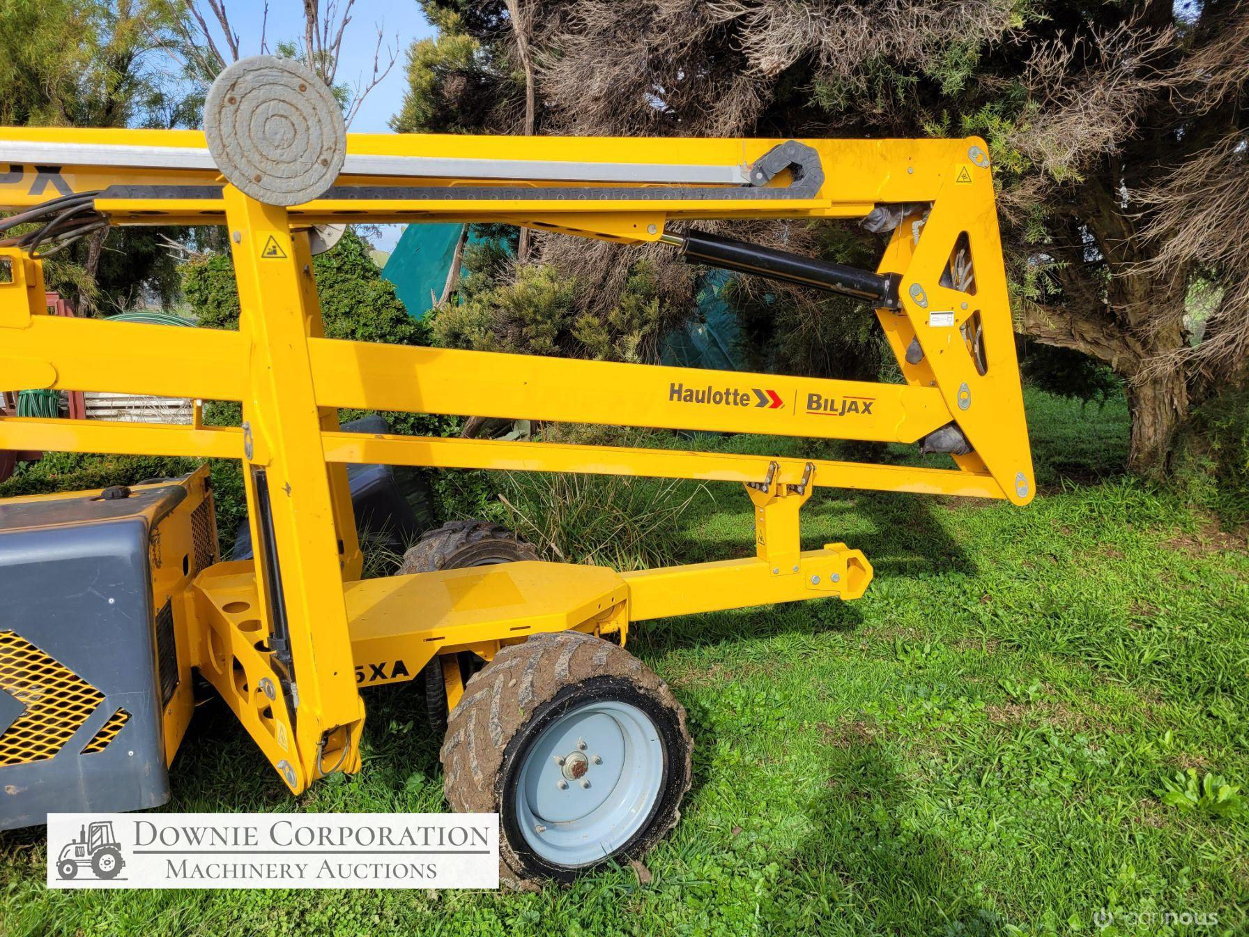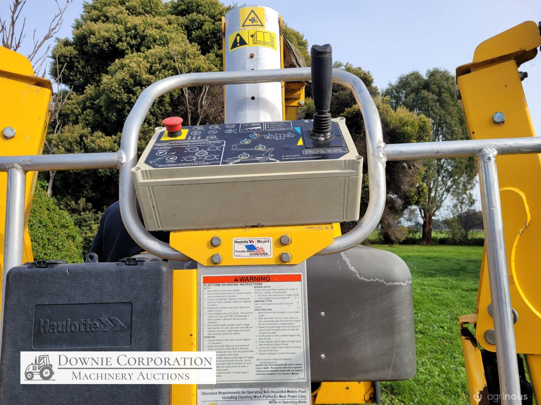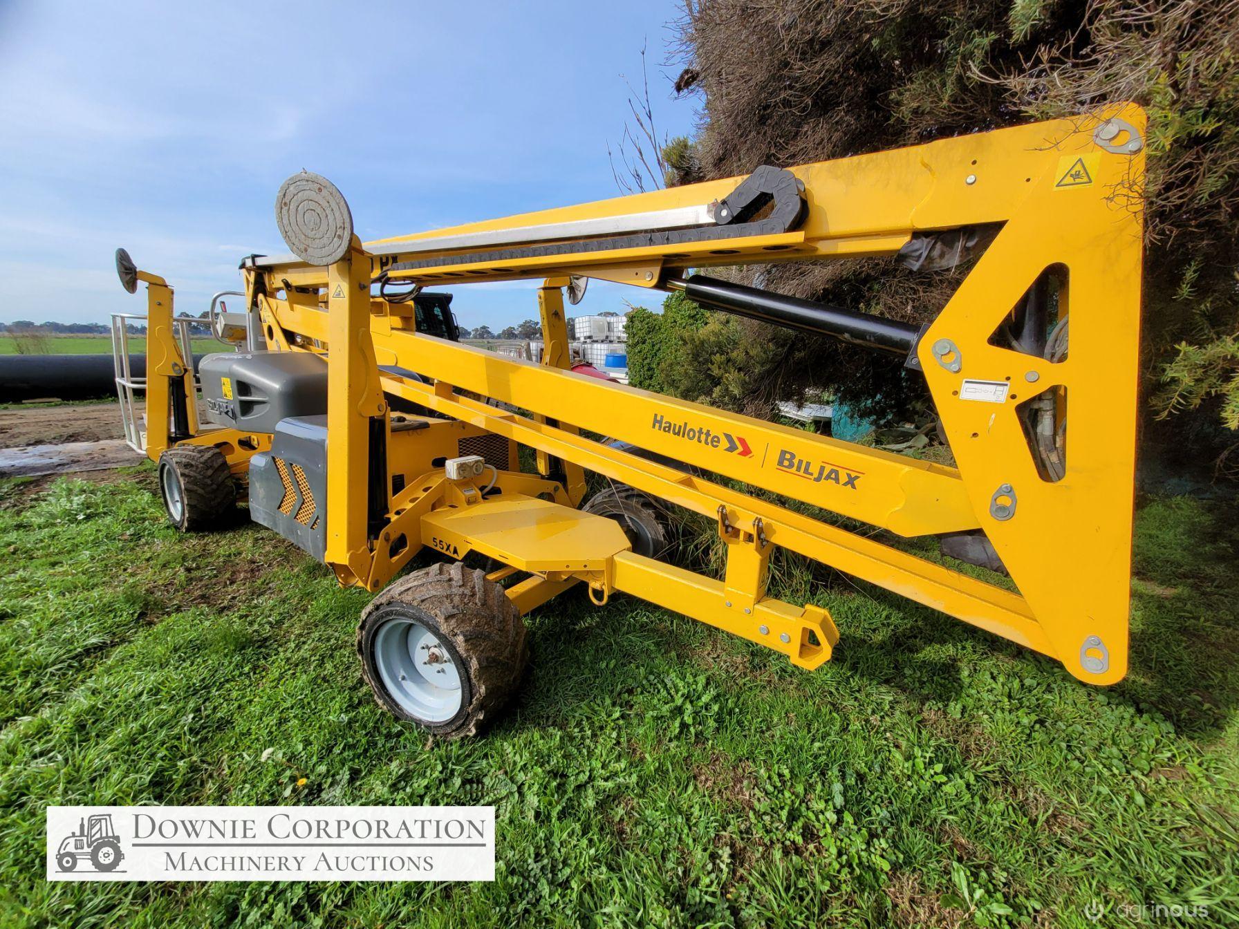 Haulotte Bil-Jax Boom Lift; Serial No. 55X1100010; 3cyl 22Hp Kubota diesel with 4 as-new Deep Cell batteries; Platform max height = 55ft (16.8m), max reach = 33ft (10.2m); Commissioned 29-10-2014, has current Vic. Certification (for safe use) V1000156; Tyres = 90%; Recently had complete service; New computer sevcom control box; New upsized (high vol) Hydraulic pump fitted.