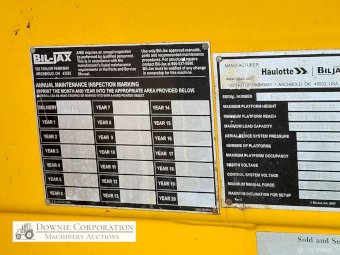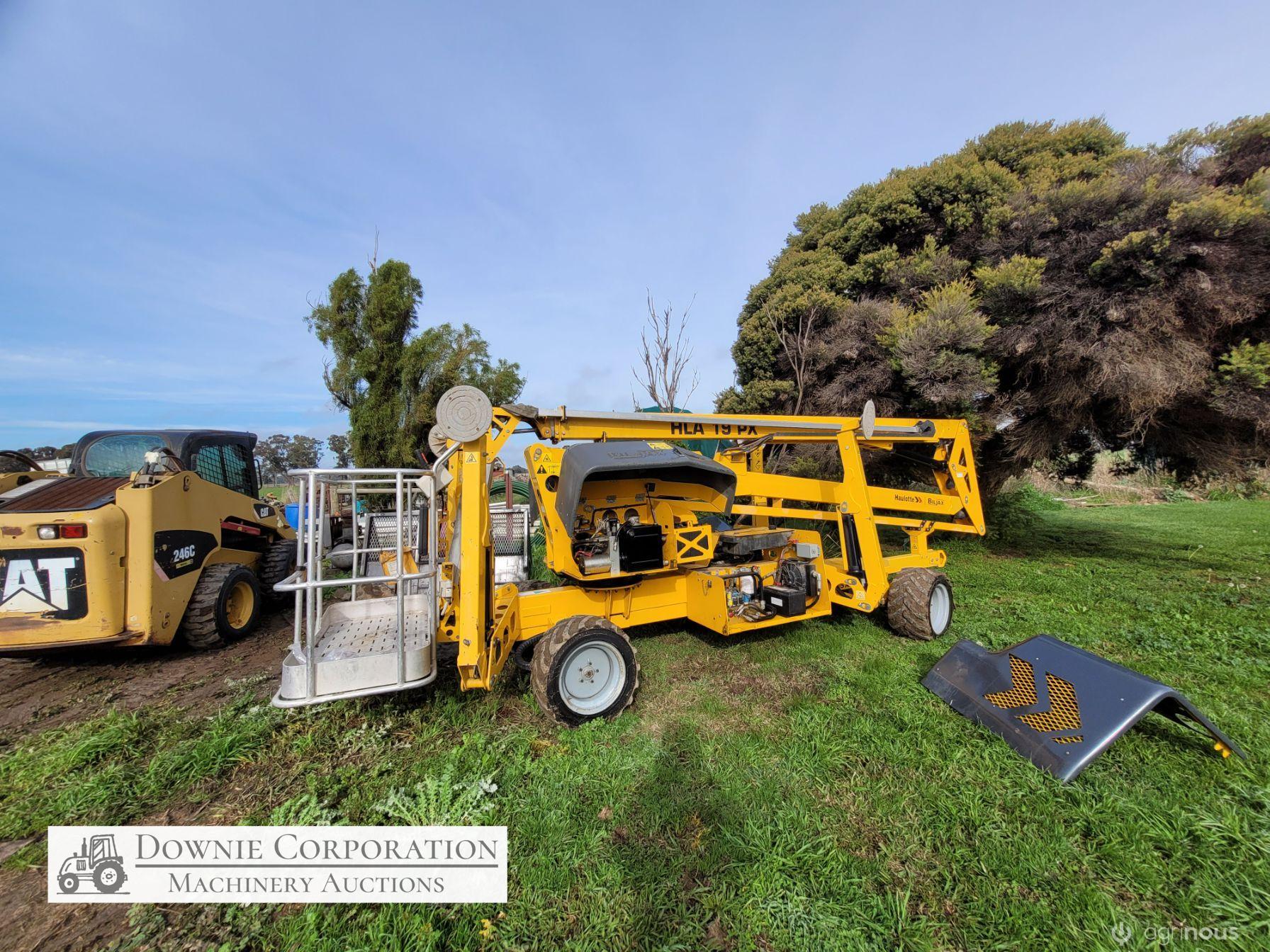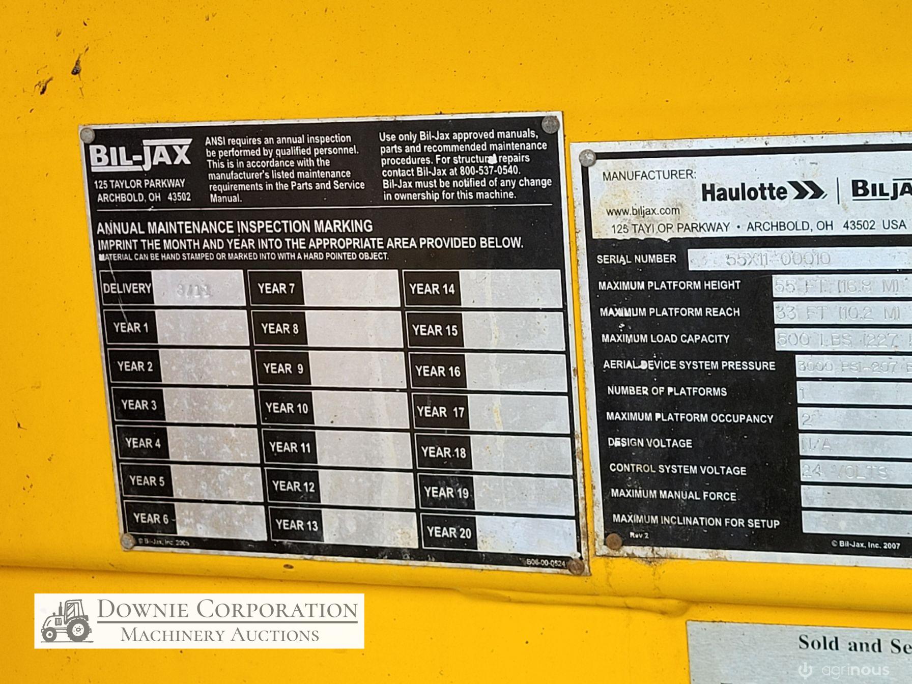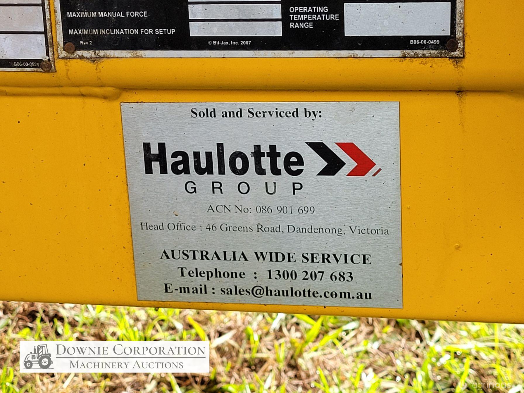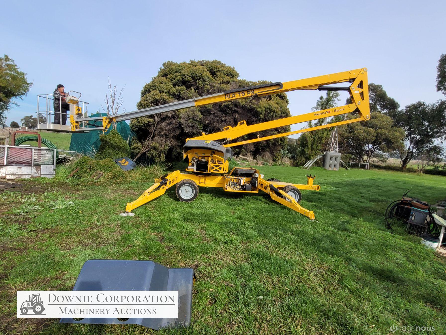 Haulotte Bil-Jax Boom Lift; Serial No. 55X1100010; 3cyl 22Hp Kubota diesel with 4 as-new Deep Cell batteries; Platform max height = 55ft (16.8m), max reach = 33ft (10.2m); Commissioned 29-10-2014, has current Vic. Certification (for safe use) V1000156; Tyres = 90%; Recently had complete service; New computer sevcom control box; New upsized (high vol) Hydraulic pump fitted.