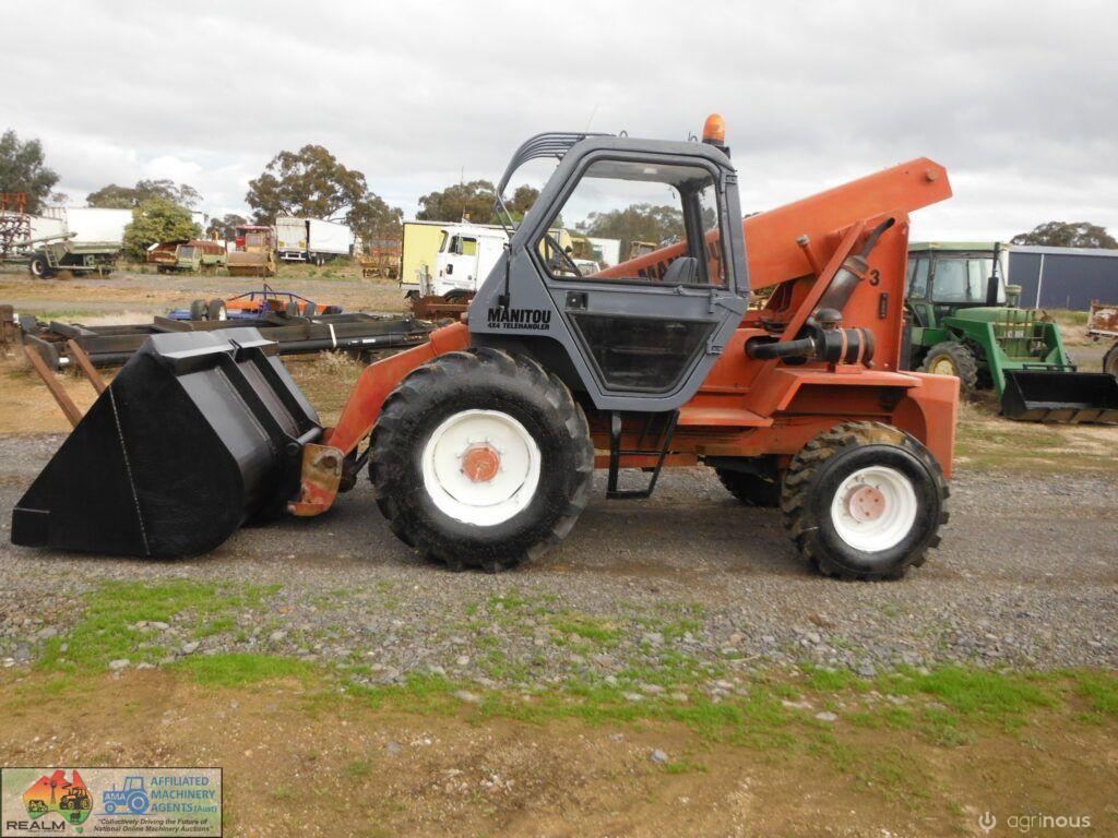 Manitou 4×4 Telehandler ~ starts runs and drives well ~ 4 speed gearbox ~ brakes work ~ Big Gp bucket and forks ~ Good tyres. ~ 5456 Hours