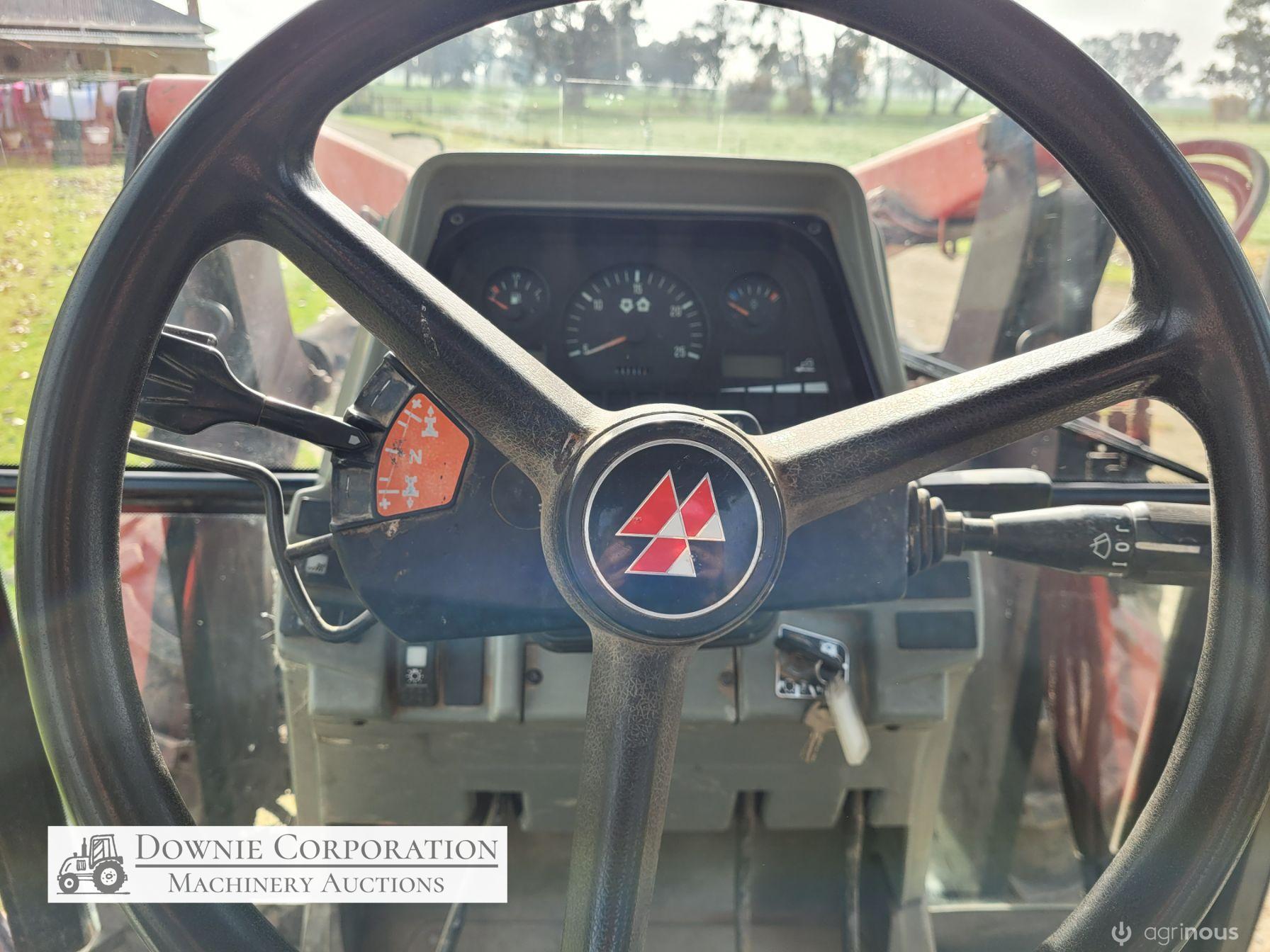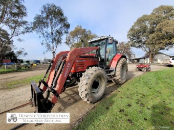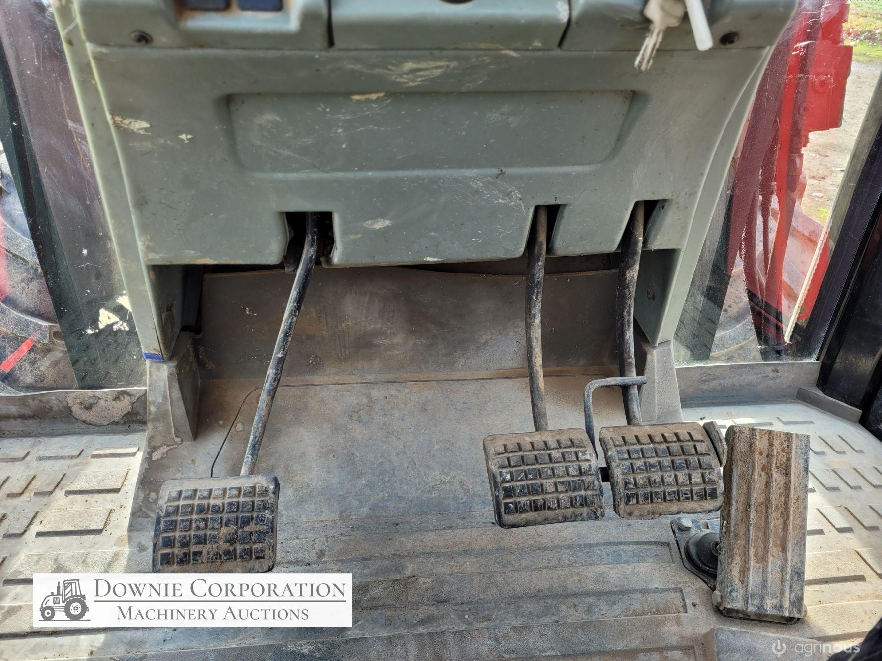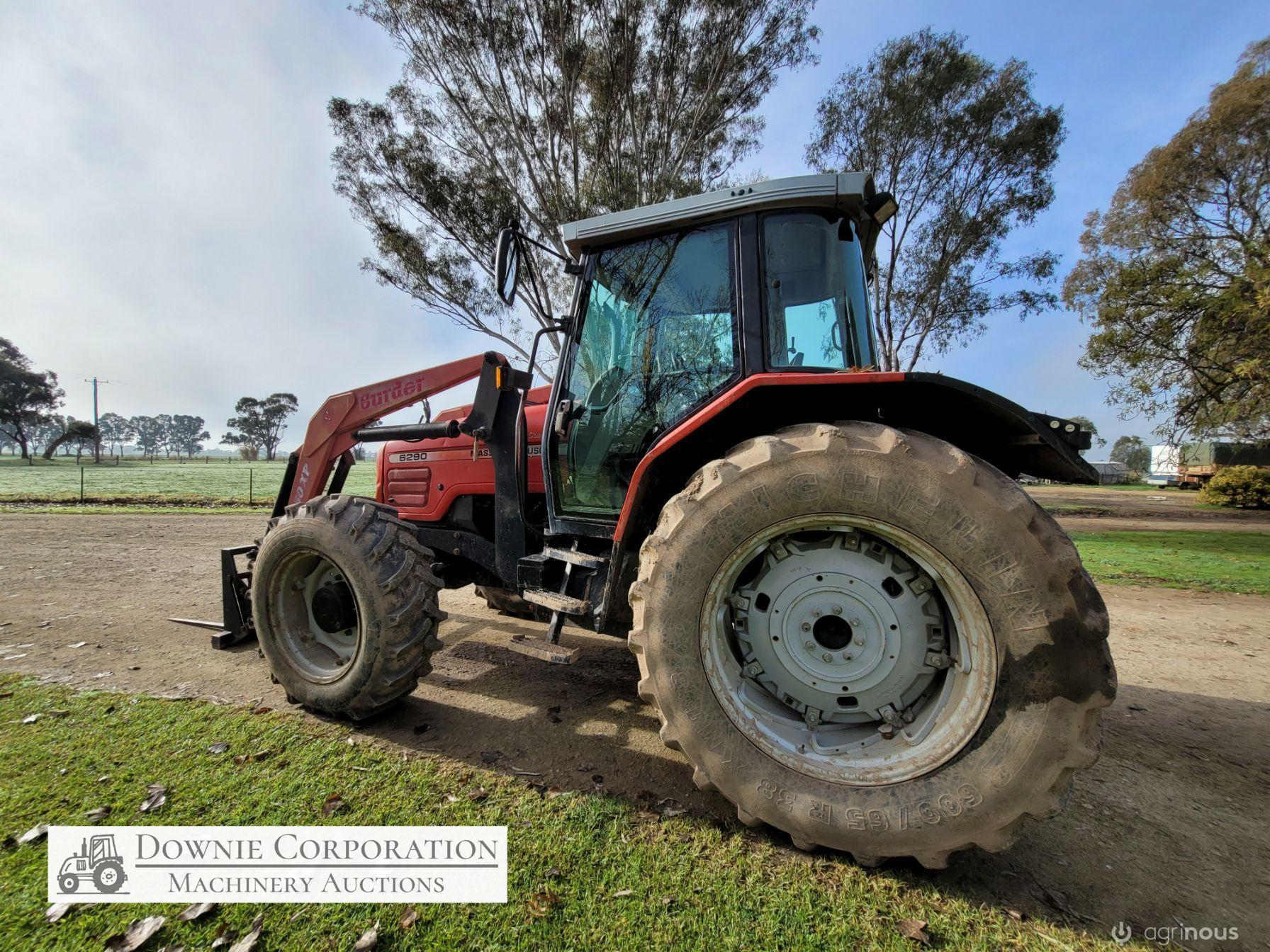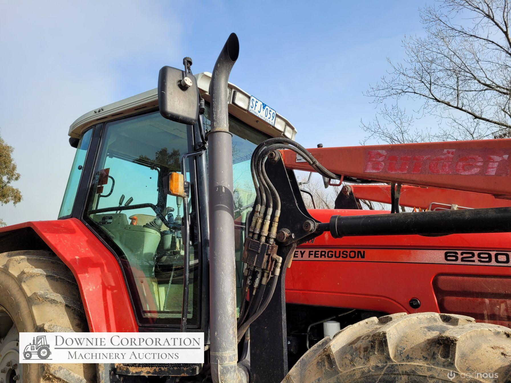 2007, MF 6290 FWA 120Hp Tractor with Burder 9050XP FEL forks only (no bucket); 6cyl diesel engine showing 9,231 Hrs. 32sp power shift transmission; A/c cab (works but may need re-gas); 3pl; Dual remotes; Tyres F=90% R=40%.