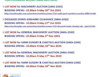 OUR NEXT AUCTIONSPLUS AUCTION (AMA-2332) ~ DECEASED ESTATE Clearing Sale (Property SOLD) ~ Bidding opens Friday 27th Oct @ 10am ~ Bidding concludes Monday 30th Oct @ 8.30pm ~ Huge variety of Machinery, Equipment & Sundries ~ DON'T MISS THIS ONE :)