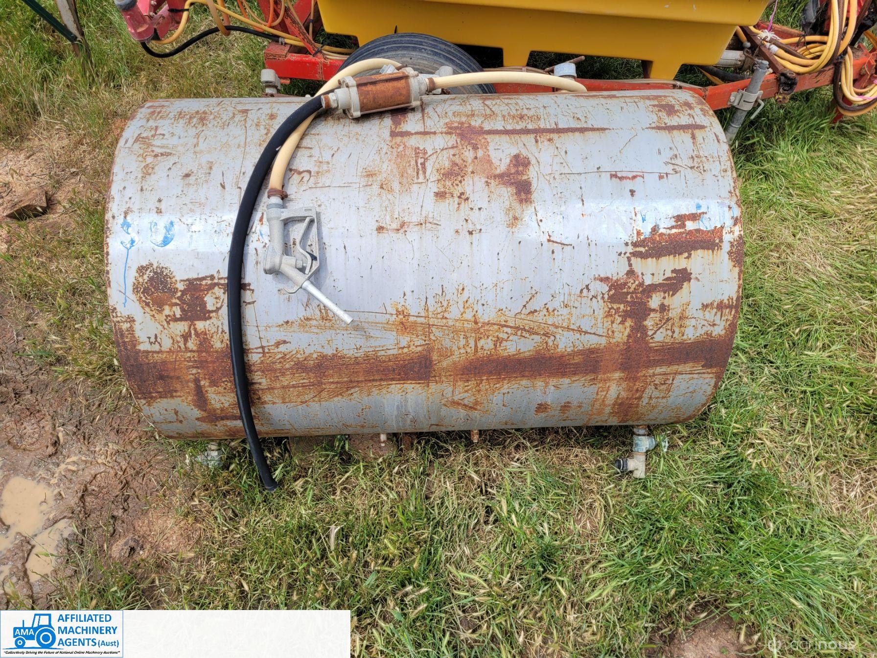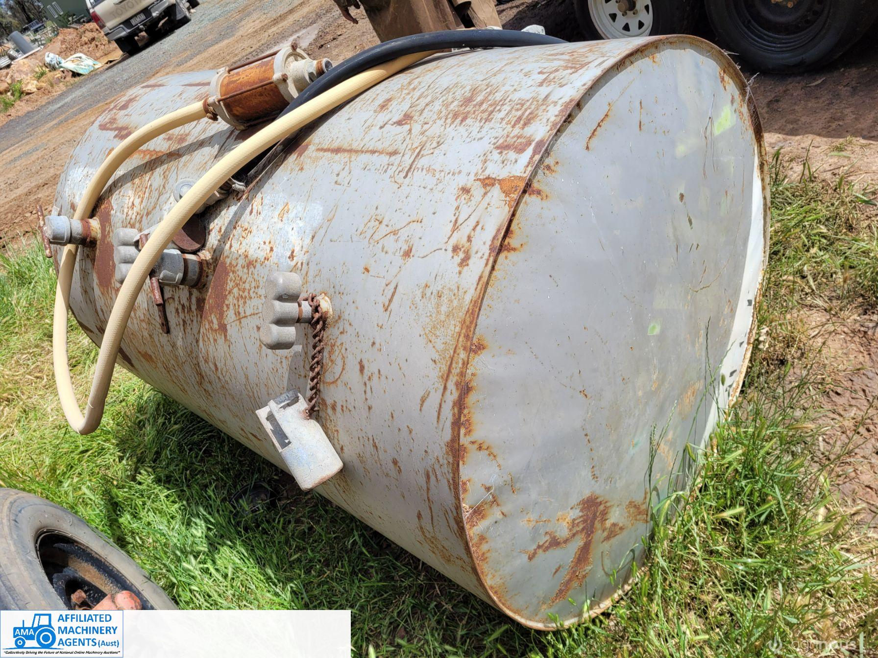 Rare Twin Fuel Bowser; 2 fully sealed separate 700 Ltr compartments, each with their own separate filler, drain & hose outlet. Designed for ULP & Diesel, comes with overhead stand. Good condition.