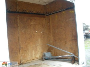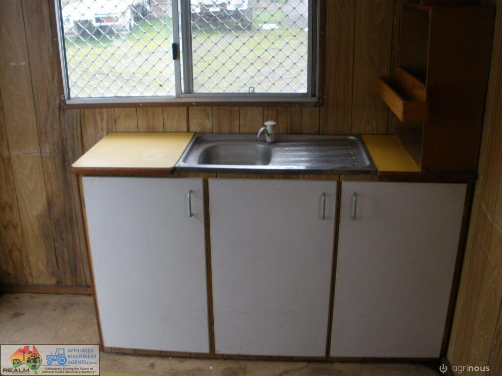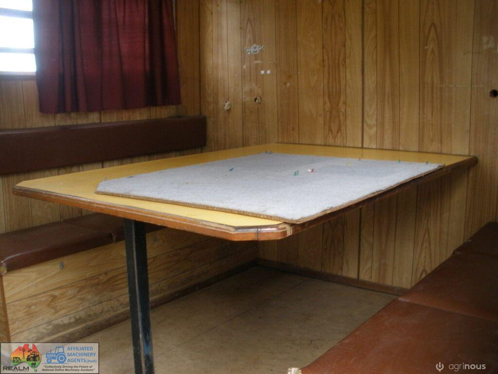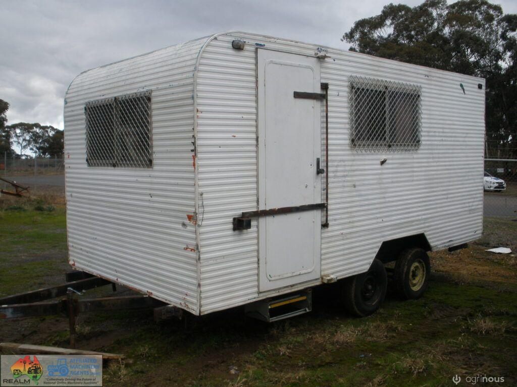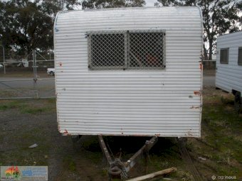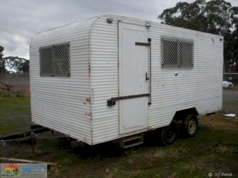 Tandem Axle Site Van ~ No power or lights ~ has table, bench seating & kitchen cabinets with sink ~ Tool storage at rear via external roller door ~ good tyres ~ ring-pull hitch ~ No vin or compliance plate ~ Body is 2.44m wide 4.8m long ~ Tool area is 1.45m internal ~ Total length is 6.7m long including draw bar and rear step ~ No rear lights ~ May have some broken window glass ~ Ideal mobile lunch room & toolbox for casual workers/pickers.