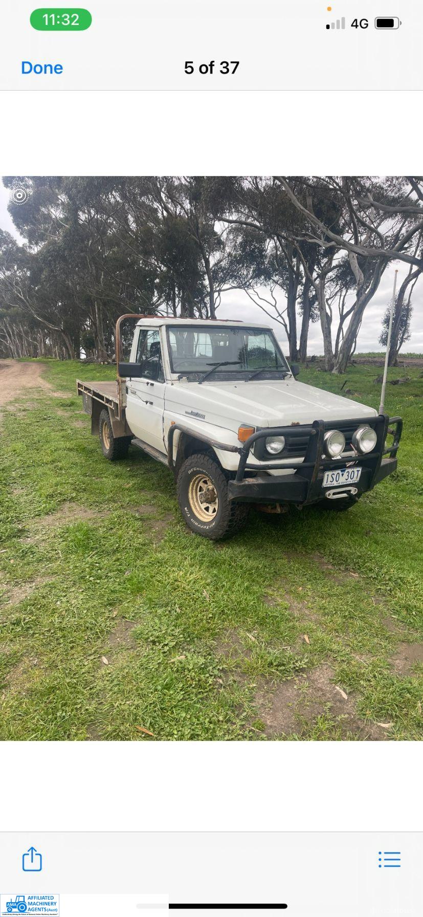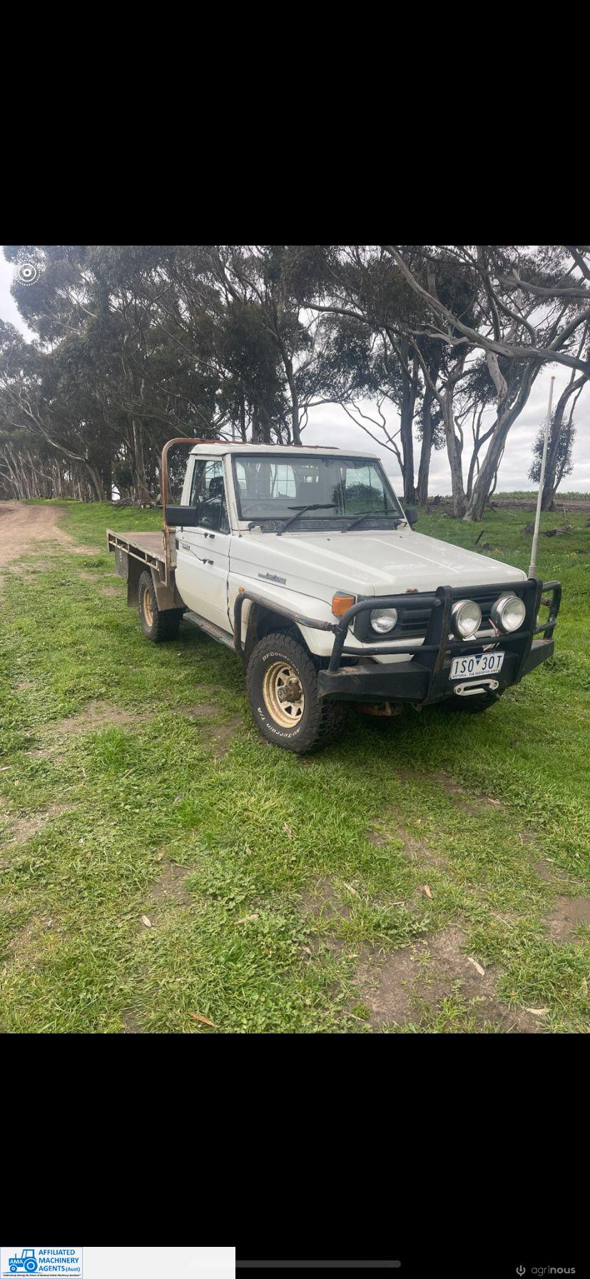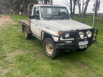 Toyota HZJ75 Landcruiser; 4.2 Ltr 6cyl diesel; 443,691 Kms; Steel bull bar; Steel tray with crate; Near new tyres; Starts, runs & drives well; Currently on Vic Rego (But sold un-reg); Has some rust under windscreen & seats worn/torn; Might pass a roadworthy with some repairs.